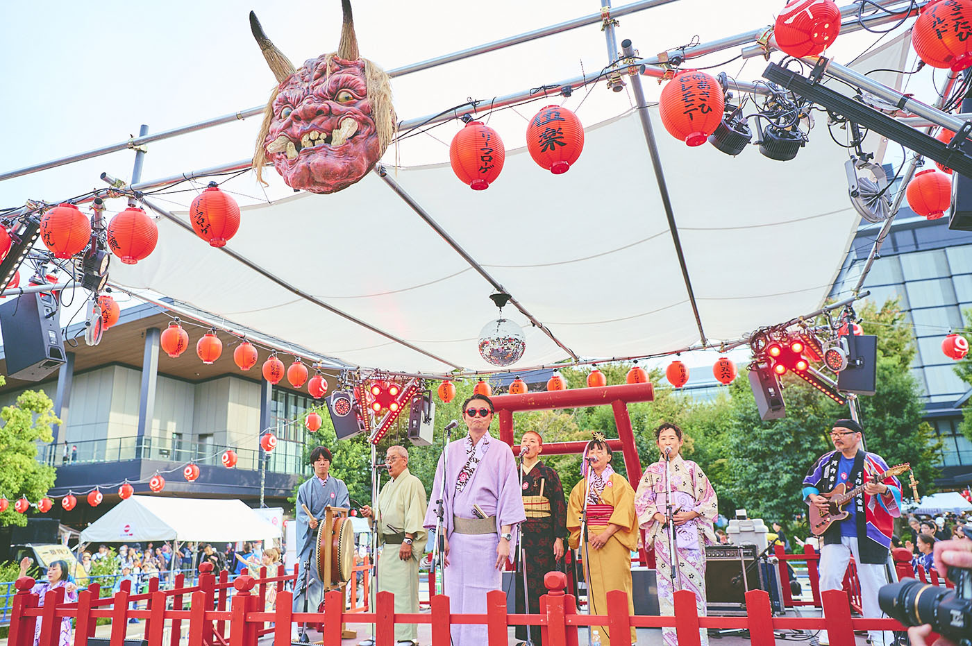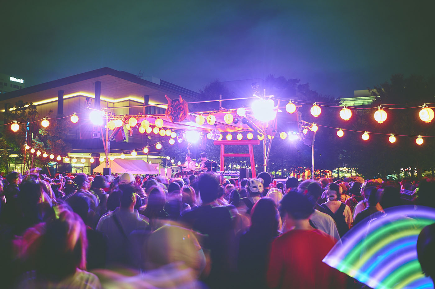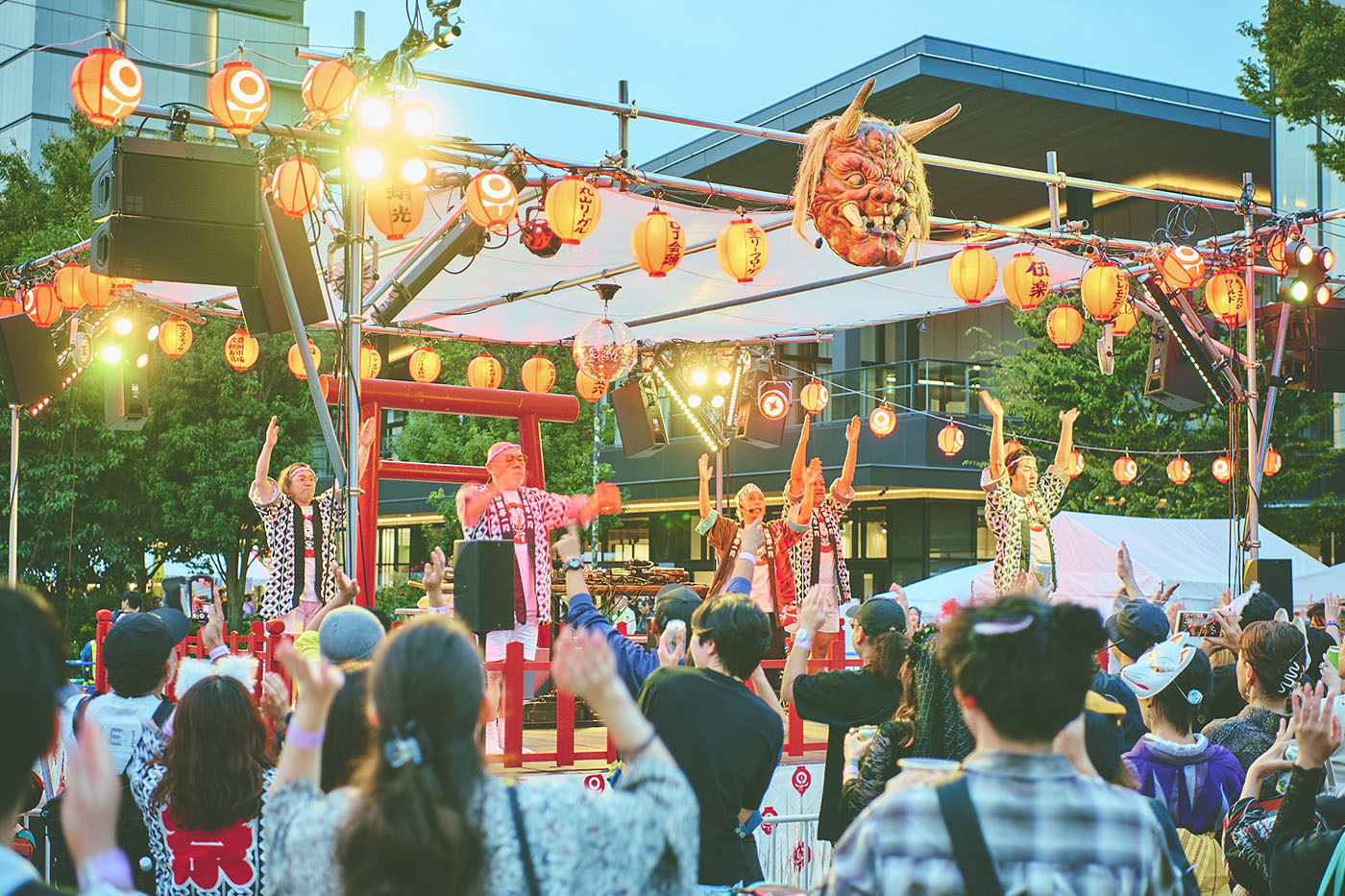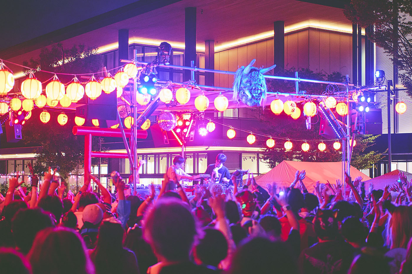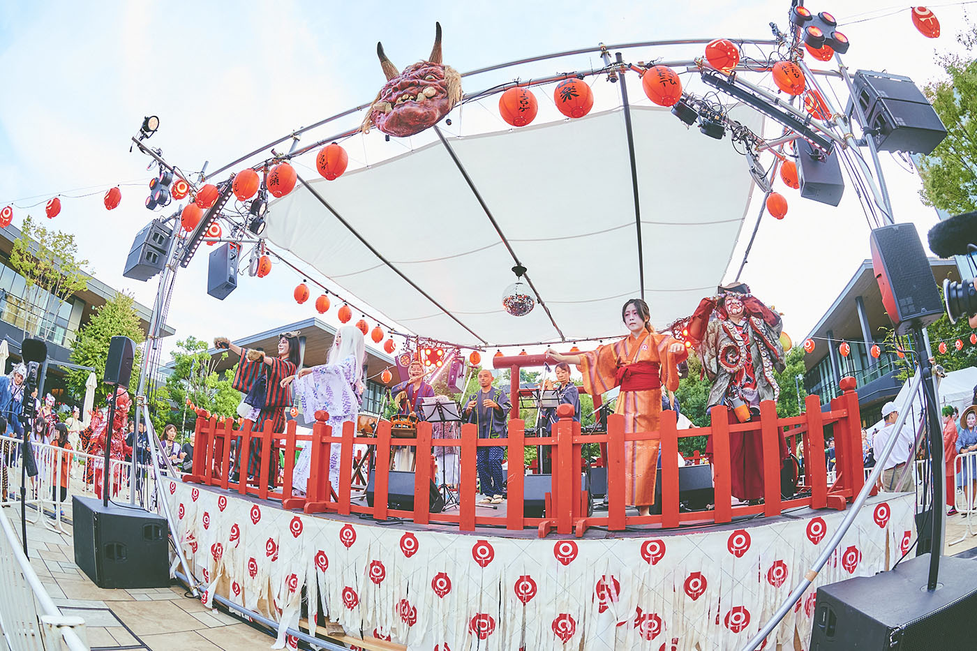立川駅から最も離れた位置まで辿り着くと、そこには巨大な『やぐらステージ』が姿を現す。立川ステージガーデン、PLAY! MUSEUM、そして人気レストランが軒を連ねる商業ビルに三方を囲まれたこのステージには提灯と鬼の面が掲げられ、そのインパクト溢れるビジュアルが目を引く。そしてこのステージを取り囲むように『盆踊りスペース』が設けられており、放たれる音楽を全身で楽しめる。実によく考えられた配置だと膝を打たずにはいられない。