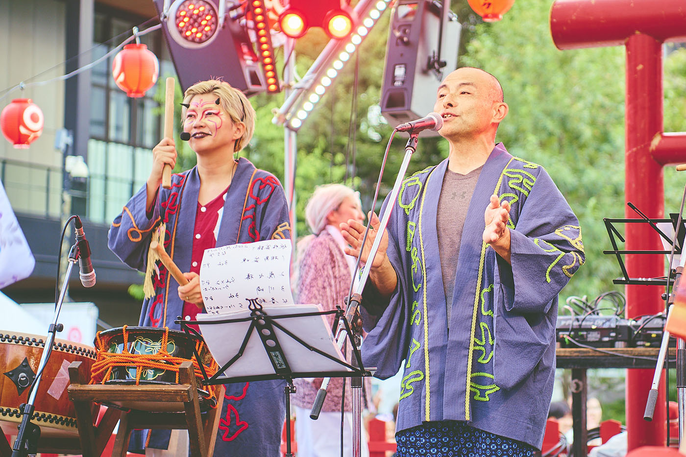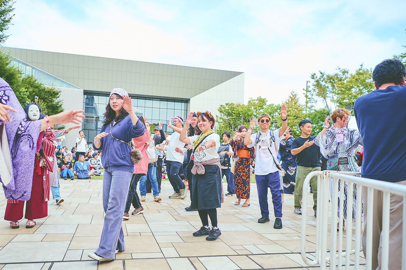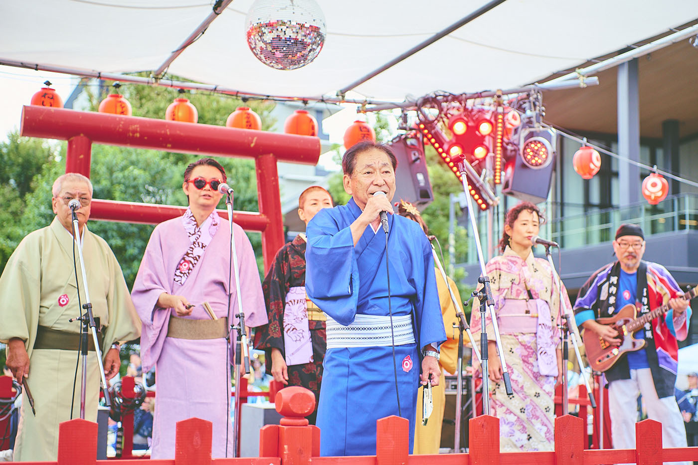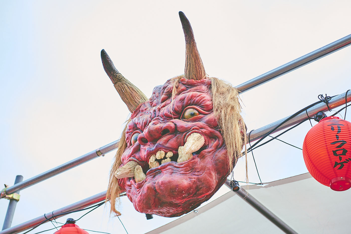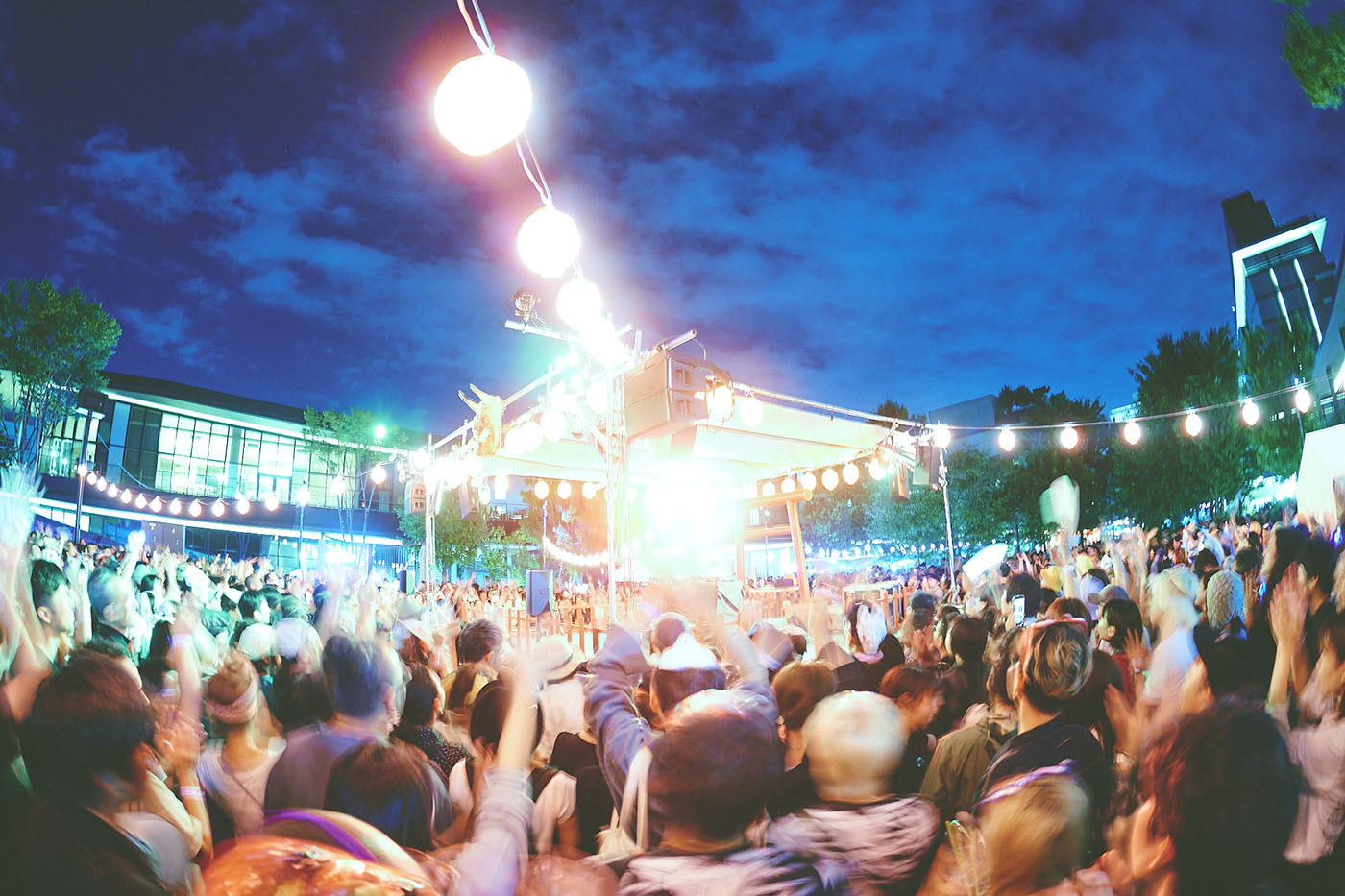 立川駅から最も離れた位置まで辿り着くと、そこには巨大な『やぐらステージ』が姿を現す。立川ステージガーデン、PLAY! MUSEUM、そして人気レストランが軒を連ねる商業ビルに三方を囲まれたこのステージには提灯と鬼の面が掲げられ、そのインパクト溢れるビジュアルが目を引く。そしてこのステージを取り囲むように『盆踊りスペース』が設けられており、放たれる音楽を全身で楽しめる。実によく考えられた配置だと膝を打たずにはいられない。