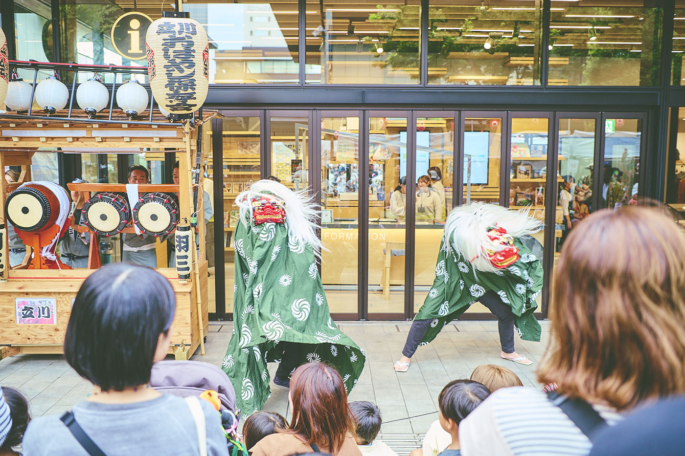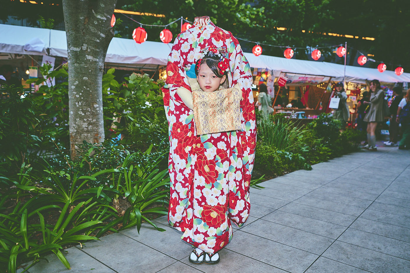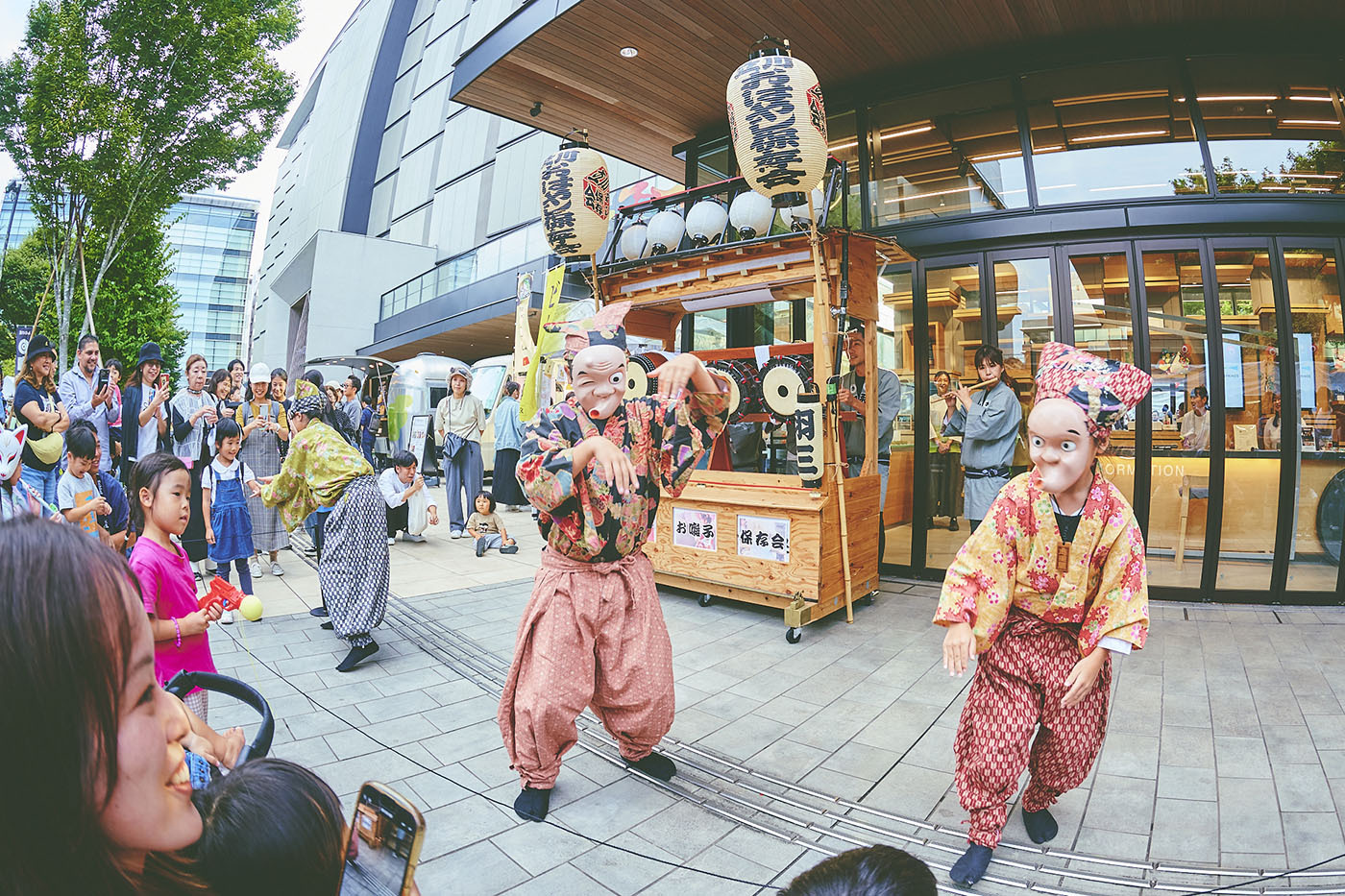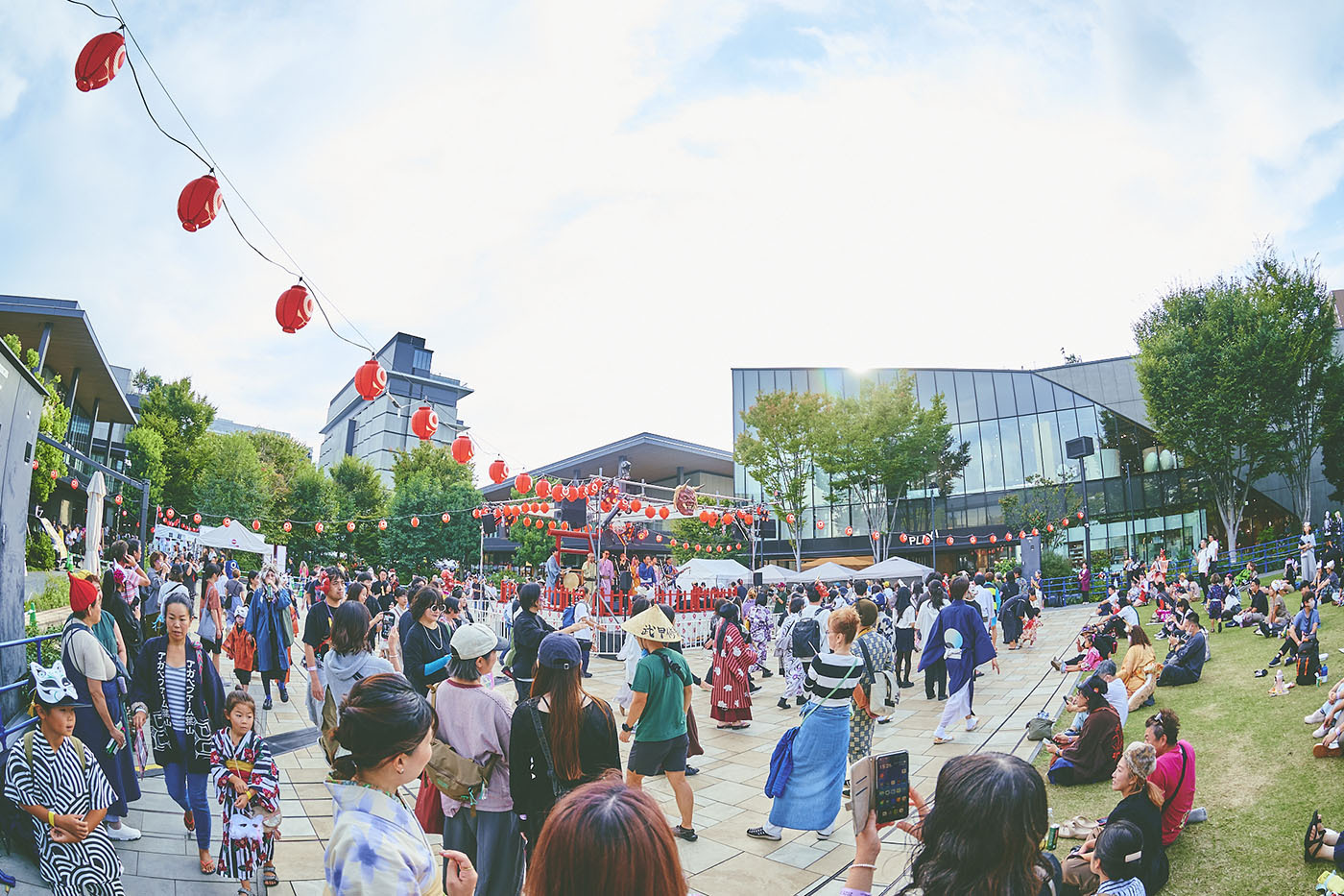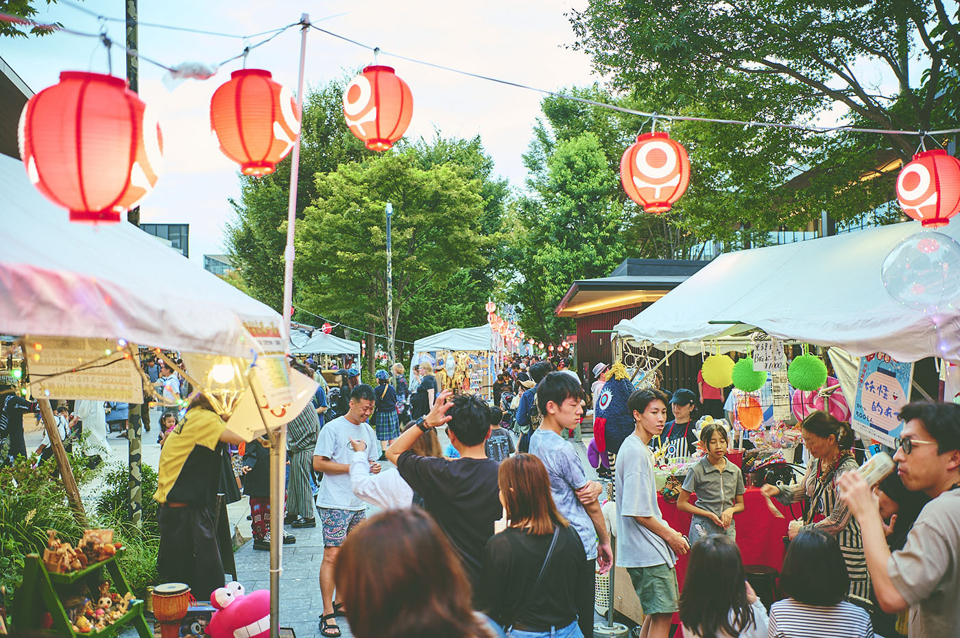 立川駅から最も離れた位置まで辿り着くと、そこには巨大な『やぐらステージ』が姿を現す。立川ステージガーデン、PLAY! MUSEUM、そして人気レストランが軒を連ねる商業ビルに三方を囲まれたこのステージには提灯と鬼の面が掲げられ、そのインパクト溢れるビジュアルが目を引く。そしてこのステージを取り囲むように『盆踊りスペース』が設けられており、放たれる音楽を全身で楽しめる。実によく考えられた配置だと膝を打たずにはいられない。