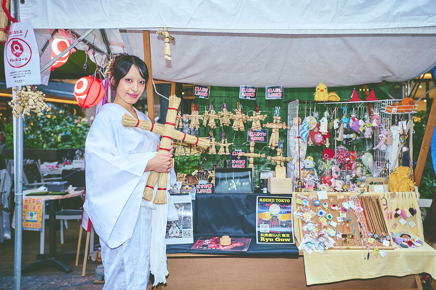 さらに奥に歩みを進めると、そこにはお祭りさながらの露天が軒を連ねる。そのラインナップはタコスやカオマンガイ、炭焼きといったイベントでは定番の食事はもちろん、靴下やTシャツ、小皿といった商品を展開するブースも。さらには藁人形や妖怪のラテックス人形を扱っている店舗も出店しており、そのレパートリーは『妖怪盆踊り』ならではと言えるだろう。さらには祭囃子響かせ、獅子舞や子供たちによるひょっとこ踊りを披露するブースも見受けられ、会場内には独特の空気が漂う。