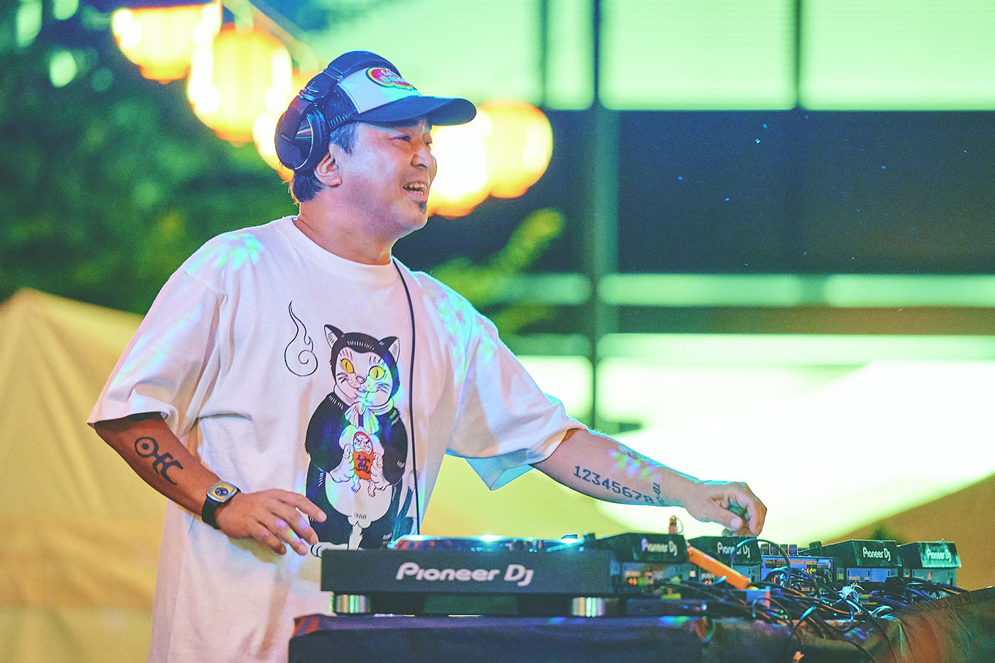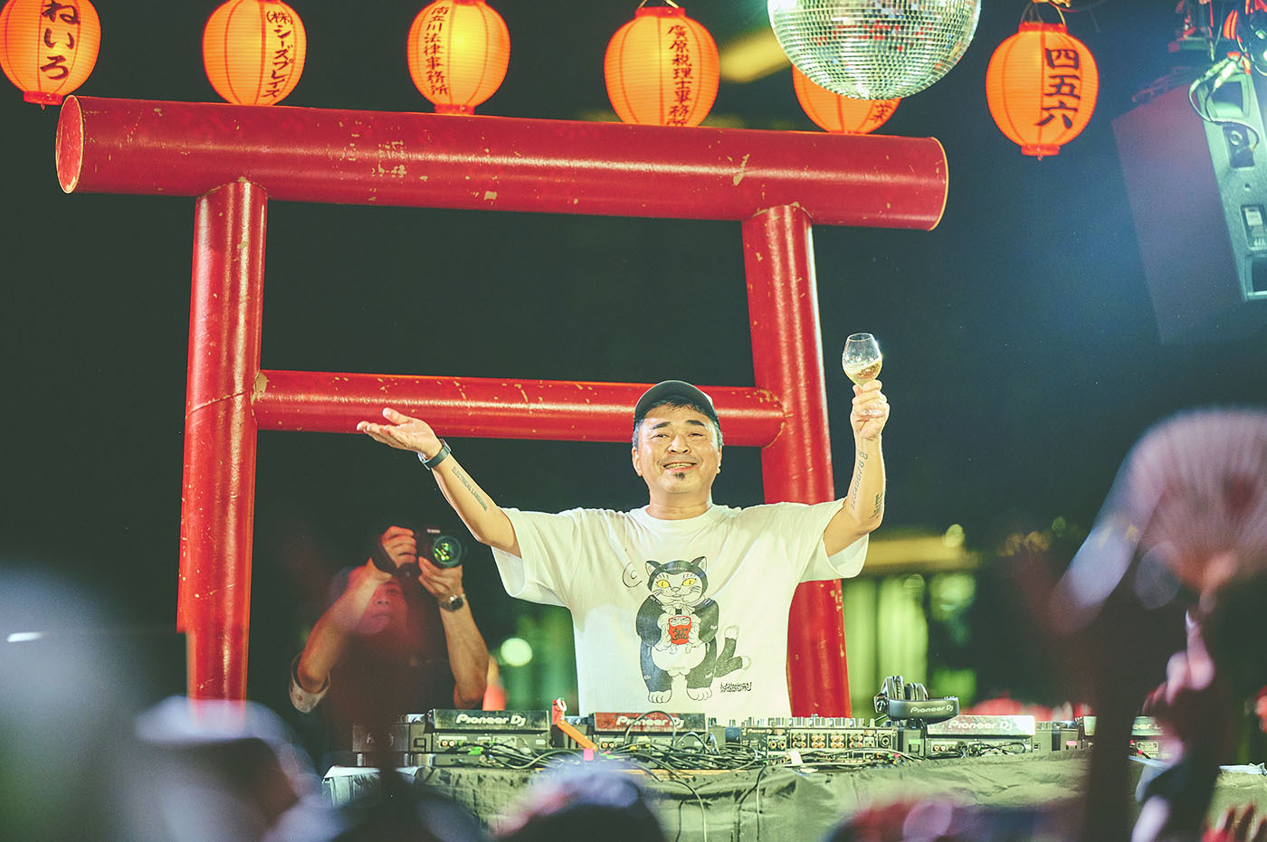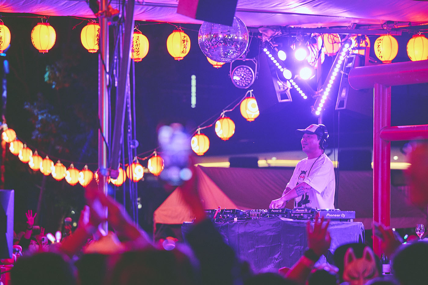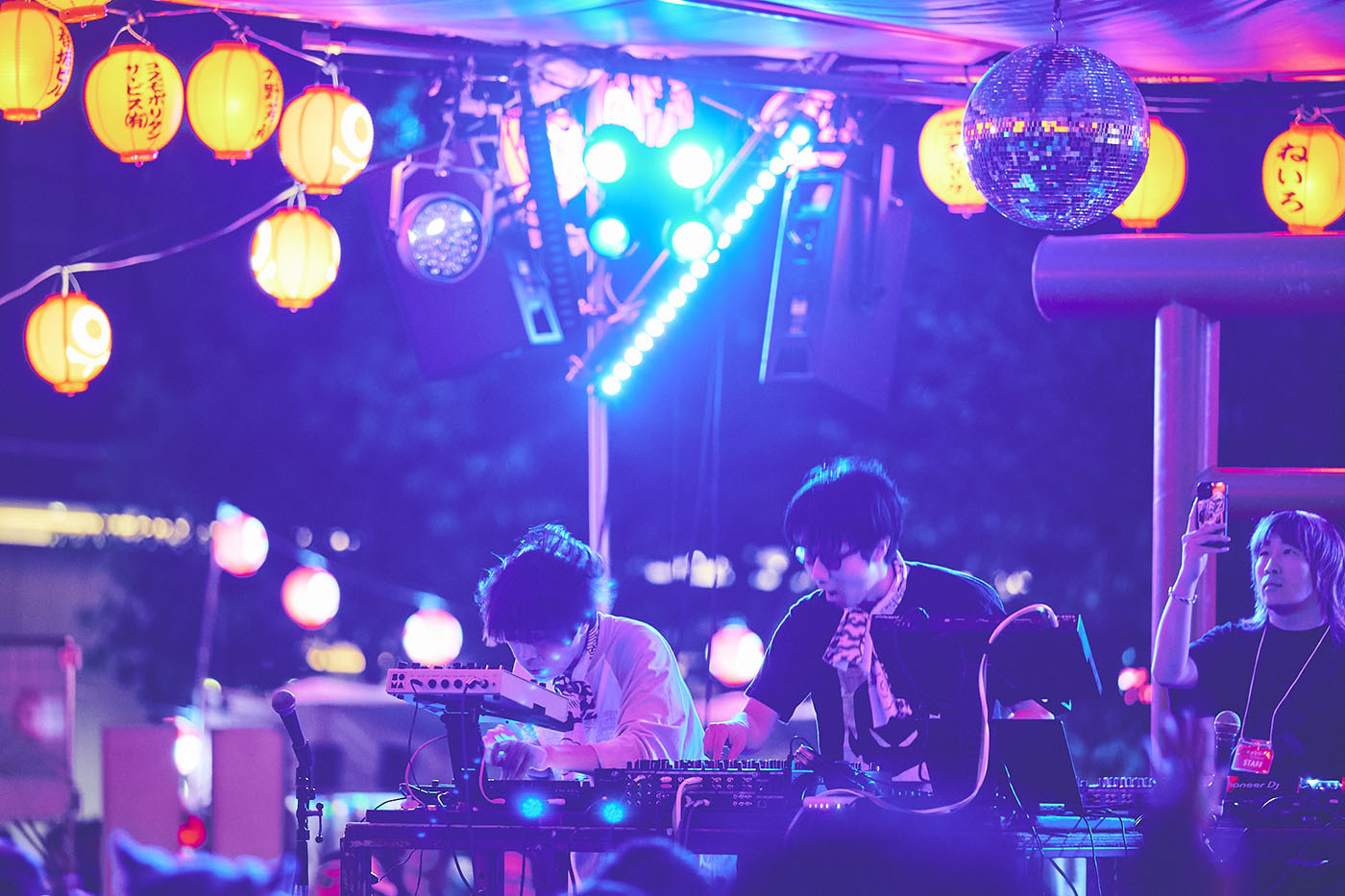さらに最終日17時以降、本ステージではDJを中心とした4組のアーティストによるパフォーマンスが展開。その一番手を飾ったのは珍盤亭娯楽師匠&火縄銃ボーイズ。「日本全国酒飲み音頭」でDJをスタートさせると、続けて「スーダラ節」「いか踊り」と和物クラシックナンバーで聴く者を惹きつける。そのビートにあわせて提灯とLEDの光が入り混じると、そこには唯一無二の空間が生まれた。