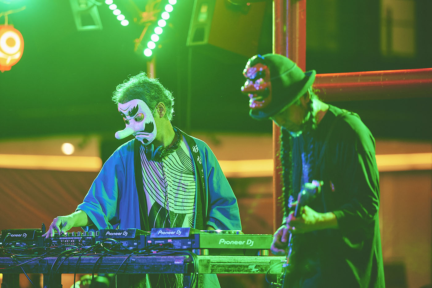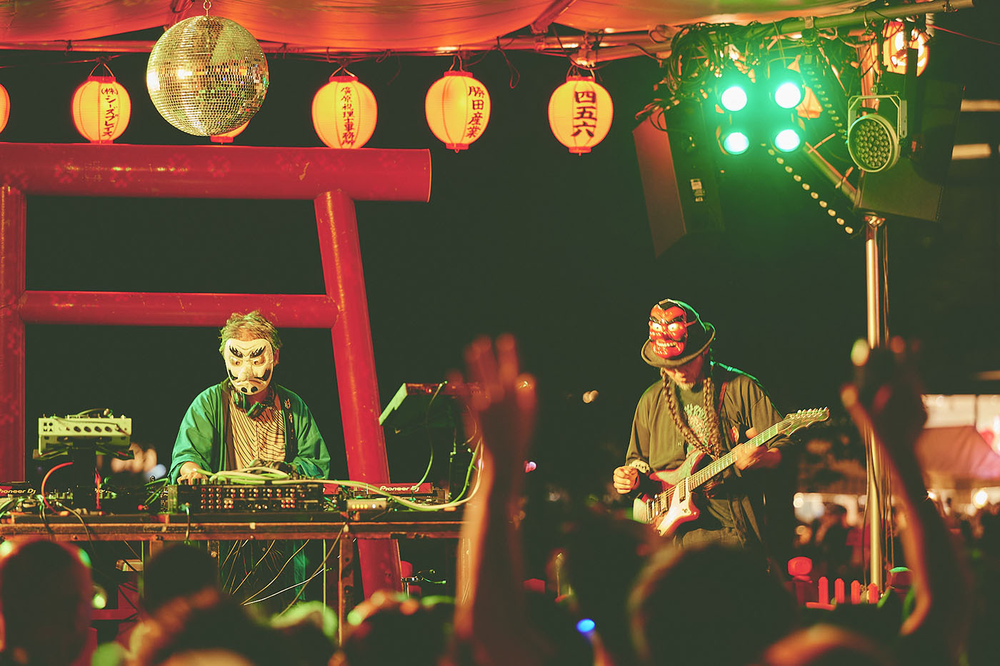 ステージには天狗の面を身につけたAtsushi K × Yoshitake Moriが登場。まずはAtsushi KがDJブースからビートを会場に届け、人々の身体を揺らす。するとそのグルーヴにあわせてYoshitake Moriがギターを爪弾かせ、会場の高揚感をさらなるものへと押し上げる。気付けば日は沈み、闇夜のなかで緑と青のライトが明滅。その光をやぐらステージに設置された巨大な鬼の面が反射すると、そこにはこの世のものとは思えない幻想的な光景が生まれていた。