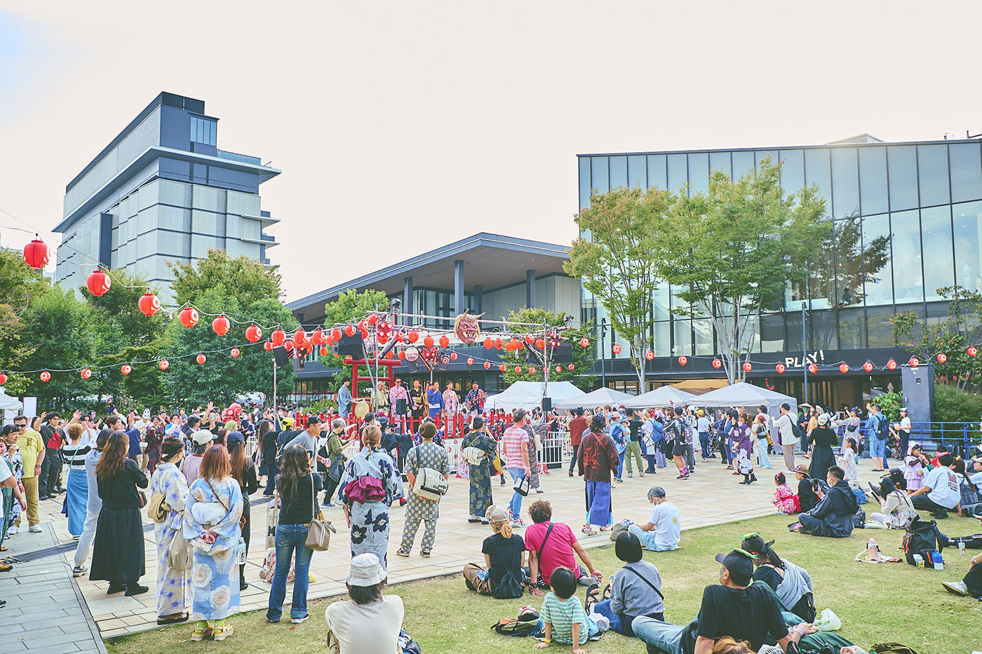 空と大地と人がつながる“ウェルビーイングタウン”をコンセプトとした立川の複合商業施設・GREEN SPRINGS。立川ステージガーデンやソラノホテル、話題の飲食店やショールームなどで構成され、訪れたものにワンランク上の時間を提供するこの場所の2階中央広場で毎年秋に開催される『妖怪盆踊り』が、今年は10月11日(土)、12日(日)、13日(月・祝)にかけて催された。『妖怪屋台村』と題した物販ブースやキッチンカーの出店に加え、『妖怪ディスコ』と題したDJブースや『やぐらステージ』におけるパフォーマンスなど、数々の演目で来た者を楽しませる本企画。そんな『妖怪盆踊り2025』の最終日である10月13日(月・祝)の様子をレポートしていこうと思う。