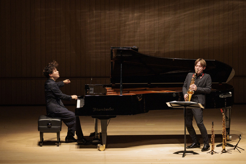 3、4曲目は4月にリリースしたアルバム『eclogue』に収録した「Eclogue(エクローグ[田園詩])と「赤とんぼ」を続けて演奏。1988年生まれの作曲家・旭井翔一が客席で見守る中、「あまり日の目を見ない楽器」とソプラニーノサクソフォンを手にすると、透明感あふれる音を丁寧に編み上げていく。季節によって変化する風や雲、雪解け水を想像させ、ピアノとサクソフォンで大自然を描いていった。