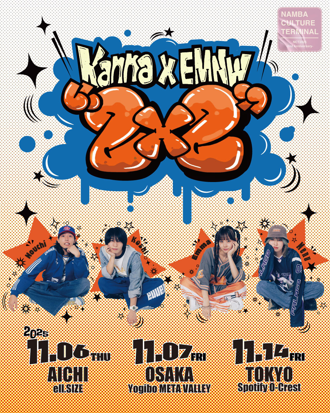 10月29日(水)にソニー・ミュージックレーベルズから第1弾シングル「ヤング・ムーヴメント」をリリースした1MC1ギターの2人組・Kannaと、2025年にライブシーンで存在感を放ってきた2MCスタイルのロックバンドのEMNW(エムニュー)。懐かしくも新しい日本語ラップにギターサウンドからチルな魅力もあるのKannaに対して、ラウドにしてポップという振り幅を持つEMNWとスタイルこそ違えど、ともに新世代ミクスチャーロックを鳴らす2組が『Kanna×EMNW“2X2”』と題したスプリットツアーを11月6日(木)から名古屋、大阪、東京の3か所で開催する。シーンの新たな胎動となるべく、今回手を組んだ2組がスプリットツアーの見どころや意気込みを語ってくれるというので、合わせて2組の出会いはもちろん、お互いの印象やそれぞれの近況も聞かせてもらった。メンバー達の言葉から早くも両者の間に生まれているグルーヴを、ぜひ感じ取っていただきたい。