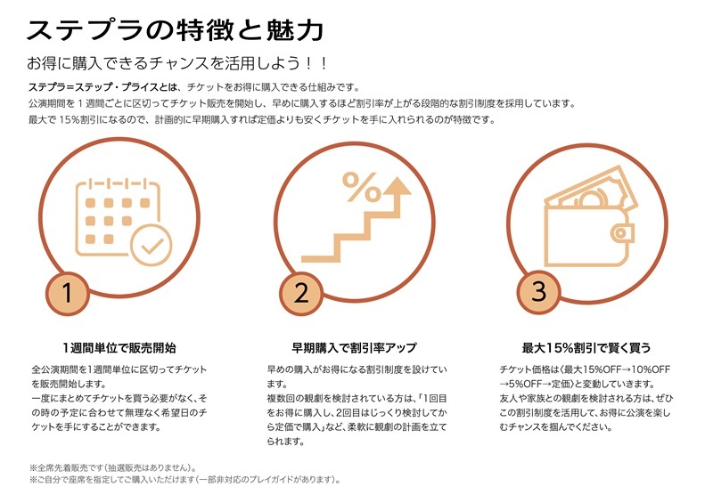 販売システム「ステプラ」(=ステップ・プライス)を利用した一般発売からスタート。ステップ・プライスとは、公演期間を1週間ごとに区切って