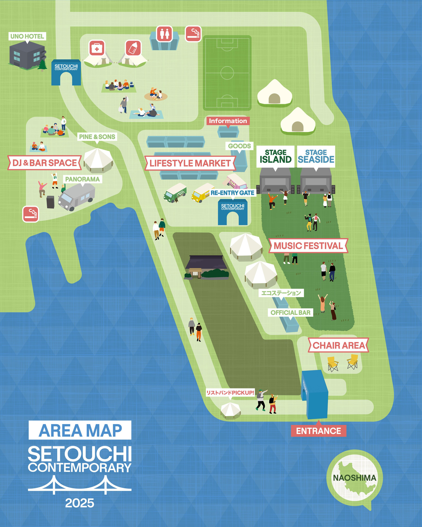 『Setouchi contemporary 2025』は「衣・食・住・遊」の複合型フェスで、今回が初めての開催となる。アートの島として知られる直島が見える宇野港ならではの絶景ロケーションで、「岡山から世界へ、世界から岡山に」をテーマに掲げ、ローカル(岡山が誇る伝統)と、アーバン(トレンド)を融合させた、新感覚の‟ライフスタイルフェスティバル”となる。さらに岡山初の試みとして、マルシェやライブ音響などの電力に自然エネルギー由来の蓄電池を活用する、環境に配慮した持続可能なイベントとなる。