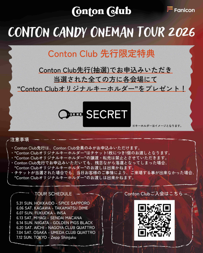 同ツアーのは、Conton Candyのファンコミュニティ・Conton Club先行が11月30日(日)23時59分まで、イープラスのオフィシャル先行が12月7日(日)23時59分まで、それぞれ受付中。なお、Conton Club先行での応募者には、“Conton Clubオリジナルキーホルダー”が会場にてもれなくプレゼントされるとのこと。