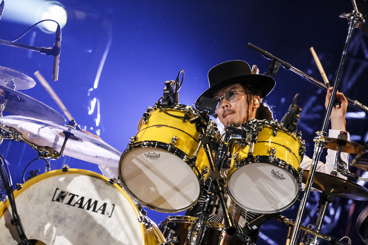 本ツアー前にリリースされた6thアルバム『EXIST!』は、このバンドが元々もっている「必ずしもバンド編成での再現性に囚われない音楽的志向」をより推し進めた作品だったが、まずはその多彩な楽曲の数々においても最もハードな方向に振り切った「Kaiju」が前半のうちに投下された。和装の女性ダンサーたちが踊り、乱舞するレーザー光線に打ち上がる炎。ハンドマイクを手に花道からコンダクターのように会場全体を煽り操る川上。ベースを低く構えたクールなプレイスタイルから時折挑発的なアクションを決め、ニヤリと笑う磯部寛之(Ba)。このド派手な展開には興奮を覚えずにいられない。さらに「Claw」「Girl A」と攻めの楽曲を並べて畳み掛けたところで、ライブ冒頭で上昇したアーチが再度下降(ちなみにこのアーチ、この後も光を放ちながらバラバラに上昇下降を繰り返したりと、通常は左右、前後に限られがちな視覚_効果に上下という新要素をもたらしていた)。アーチを抜けた花道の先端へとフライングVに持ち替えた白井眞輝(Gt)が進み出て、鳴らされたイントロは「Kick&Spin」! この曲で川上はハンディカメラを手にしながら歌い、その映像はリアルタイムでスクリーンに映し出されていたのだが、時折「自撮り」の格好で自らをフレームインさせながらフロアを撮るというニクい演出も。間奏のメタリックな箇所では怒涛のバスドラ連打にあわせヘドバンの嵐が巻き起こるという、全くもって容赦ない前半ブロックの締めくくりとなった。