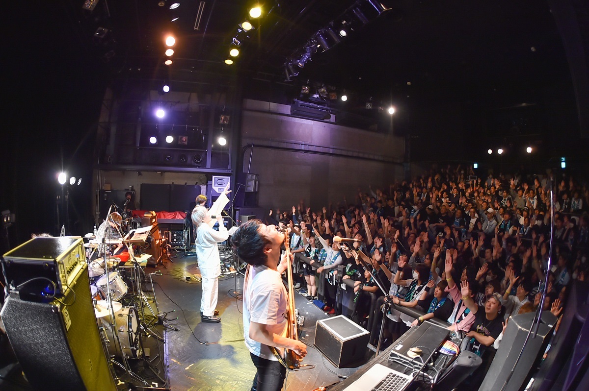 「私がどうしてもバンドで歌いたかった曲です」と紹介したインディーズ時代の楽曲「星と太陽」のあとは、それまでのしっとりとした雰囲気からは一転して、和テイストのロックナンバー「ツキウサギ」、ゲームミュージック風のデジタルサウンドに合わせたコミカルな振り付けでも盛り上げた「エスカレーターエレベーター」で、ライブは最高のクライマックスに向けて熱量をあげていく。ラストは「夏の祭りのわっしょい歌(か)」。フロアに様々な色のカラフルがぐるぐるとまわり、笑顔と歓喜に包まれてライブは幕を閉じた。