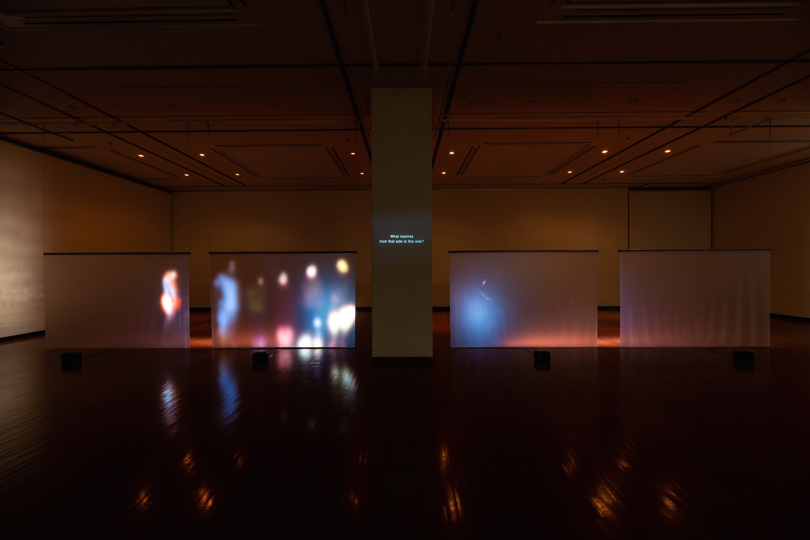 岡田 映像を何に投影しているか、という点で説明すると、半透明のカーテンに投影している作品。ハーフミラーに投影している作品。美術館の展示室内の非常口の扉に投影している作品。スマートフォンの中の動画としての作品、などがあります。