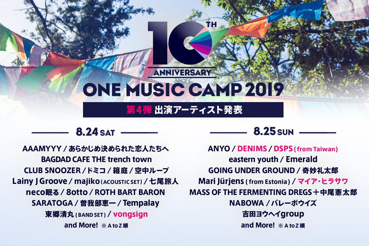『ONE MUSIC CAMP 2019』第4弾アーティストに DENIMS、DSPS(from Taiwan)、マイア・ヒラサワ、vongsign4組、日割り発表も