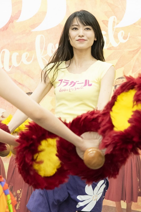 「GO!フラガール!!」の掛け声に続き、スローで穏やかな2曲目が始まる。他のキャストより稽古に入ってからの日が浅い井上も加わって、口元に笑みをたたえつつ女性らしい腰づかいや手つきが特徴的なフラが優雅に披露された。