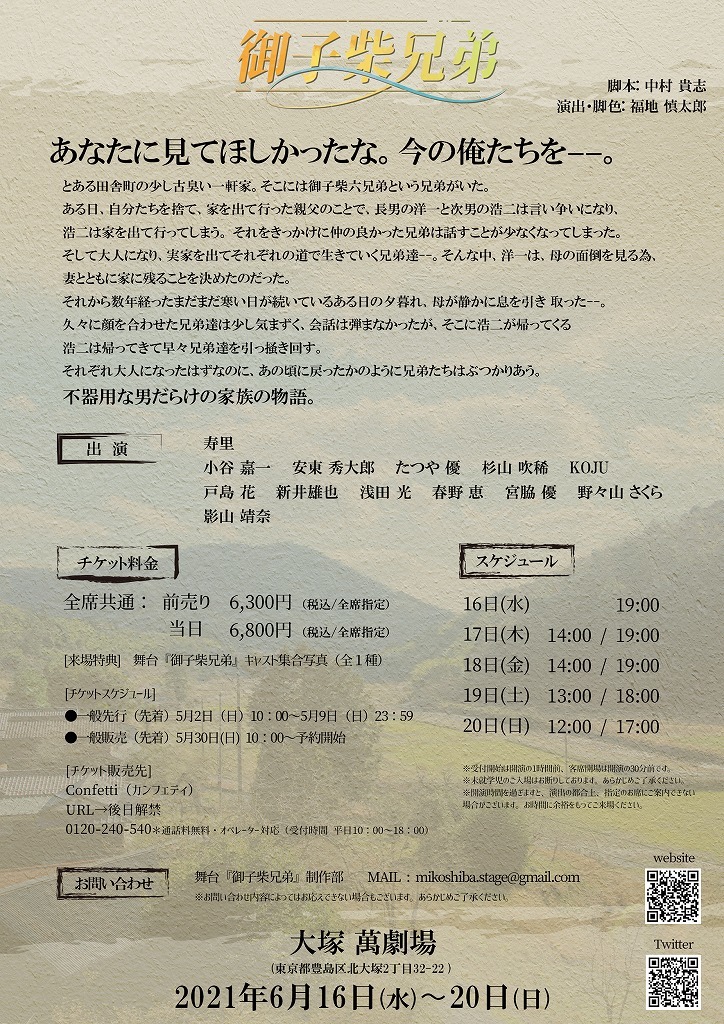 寿里主演、温かい家族の物語を描く舞台『御子柴兄弟』の上演が決定 メインキャスト2名のオーディションも開催の画像1/14 SPICER ニュース 舞台 2021.4.9 前の画像 記事に戻る 次の画像 舞台『御子柴兄弟』 その他の画像