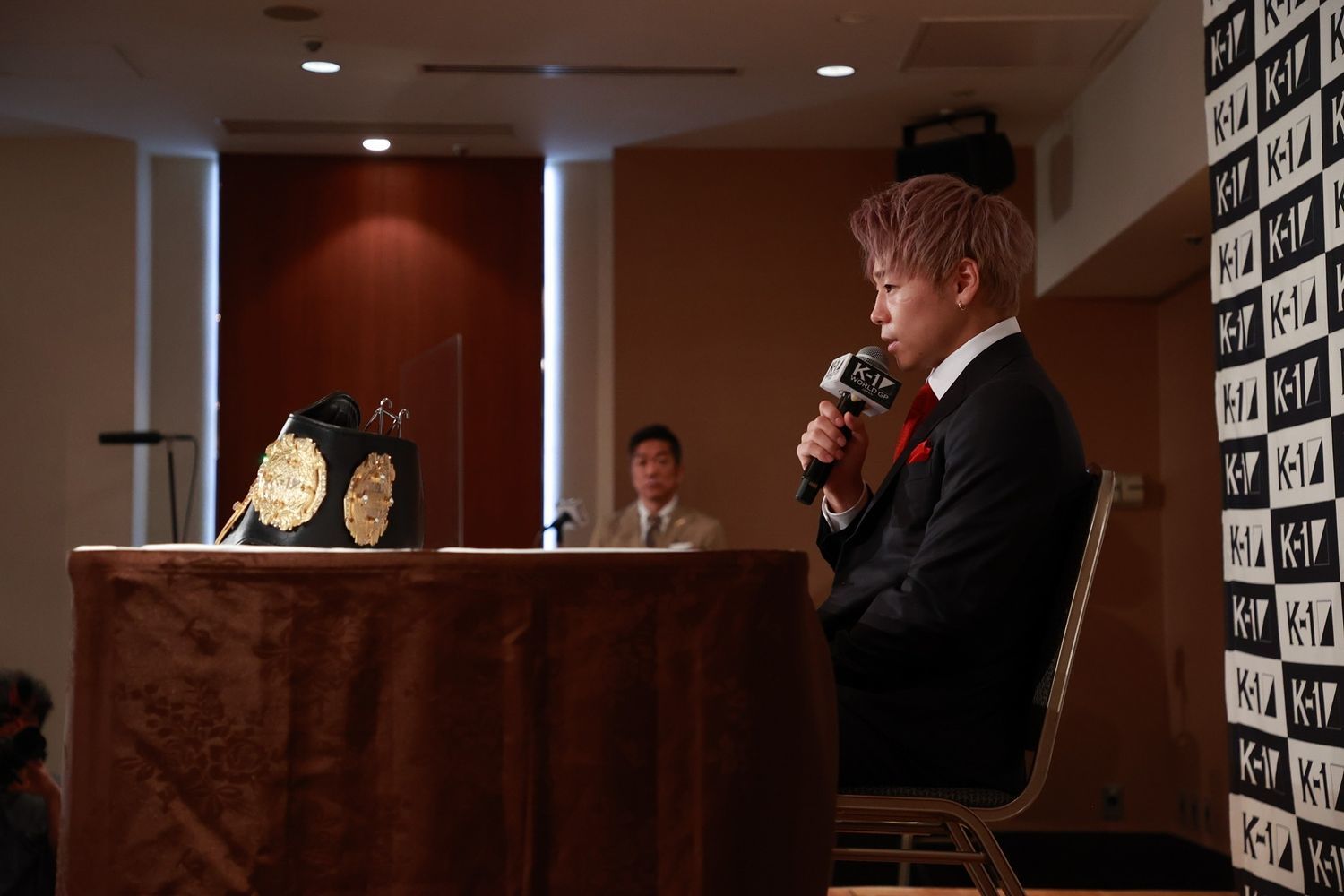 あと、もう1つ報告したいことっていうか、発表させてもらいたいことがあるんですけど、今回負けてしまって、K-1の大将としてK-1を背負わせてもらって、ずっと戦わせてもらって、今回の試合もK-1の代表として戦ったつもりだったんで、そのK-1の代表として負けてしまったということは、僕はもうK-1を背負う資格はないなと思っています。ケジメとしてこのベルトは返上させてもらって、次の世代にバトンタッチしたいなと思っています。