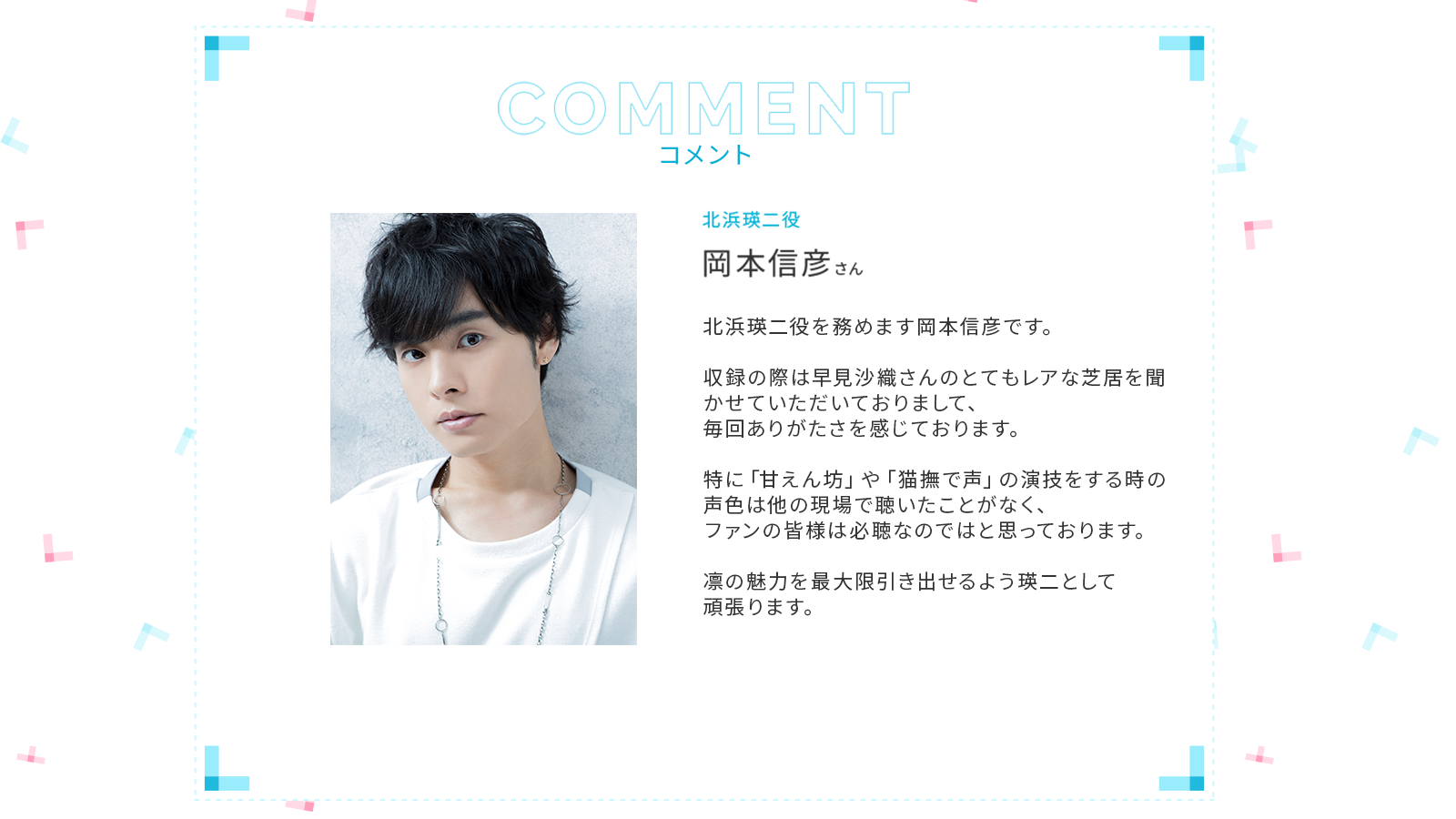 そして演劇部に所属する高校2年生の大道具担当・北浜瑛二役を岡本信彦が、同じく演劇部に所属する高校1年生で期待のホープ・七倉 凛役を早見沙織が演じる。キャストの二人、そして原作・斉藤ゆうからアニメ化決定に際して意気込みを語るコメントが届いている。