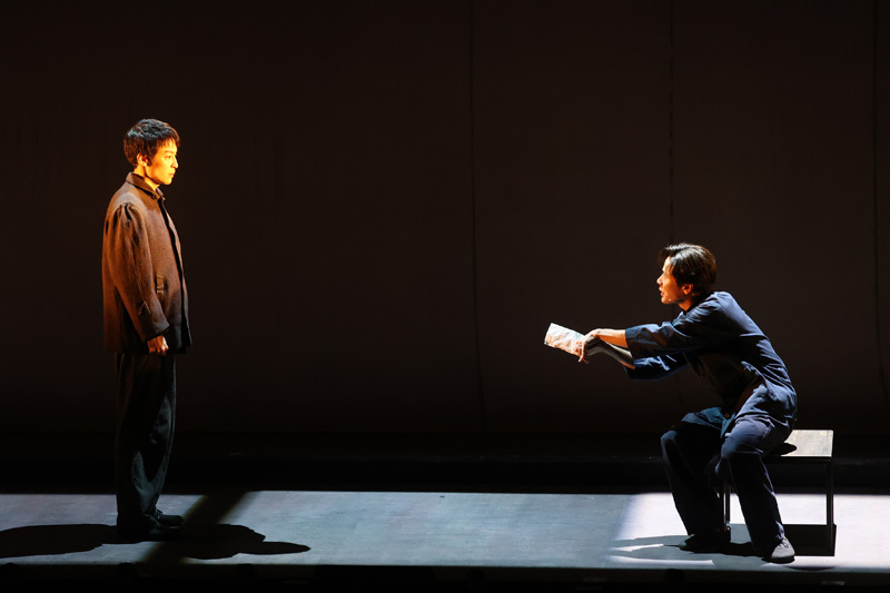 そのセフンのペンネームである「ヒカル」を演じるのは木下。ヒカルはセフンから生まれる存在であるため、冒頭からラストまでさまざまに変化していくのだが、木下がどのヒカルも力強く魅せていく。中でもセフンが「完璧なヒカルであろう」と決めてからめきめきと輪郭がハッキリしていく様は見事。そしてそこからの変貌もまた目を見張るものがあった。キッパリとした美しさ鮮やかさは魅惑的。ヘジンが惹かれ、執着するわけがすんなりと見える。またヒカルが持つ「独特な文体」はこの舞台では当然文章ではなく音楽で表現している。そういったナンバーもおもしろく、ヒカルが登場する度にその輝きがさまざまな痕跡を残していった。
