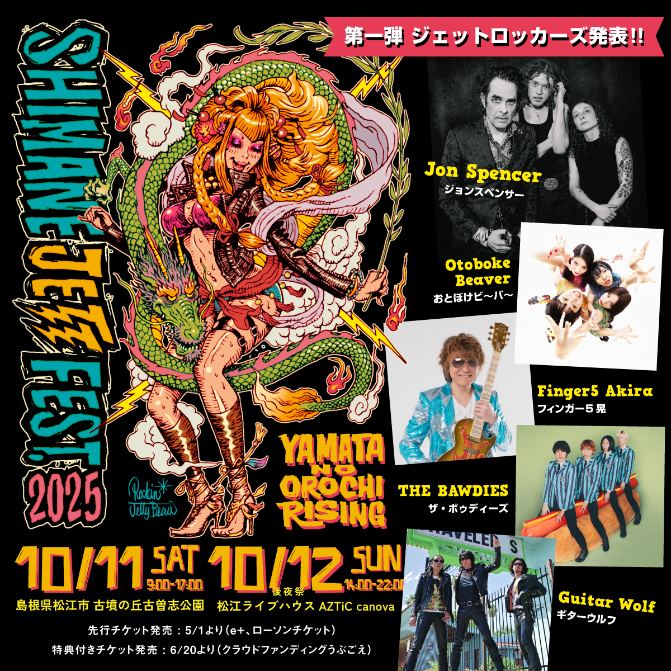 9年目の開催となる今回の『シマネジェットフェス・ヤマタノオロチライジング2025』では、ギターウルフのほか、ジョンスペンサー、THE BAWDIES、おとぼけビ~バ~、晃(フィンガー5)が第1弾アーティストとして出演することが決まっている。