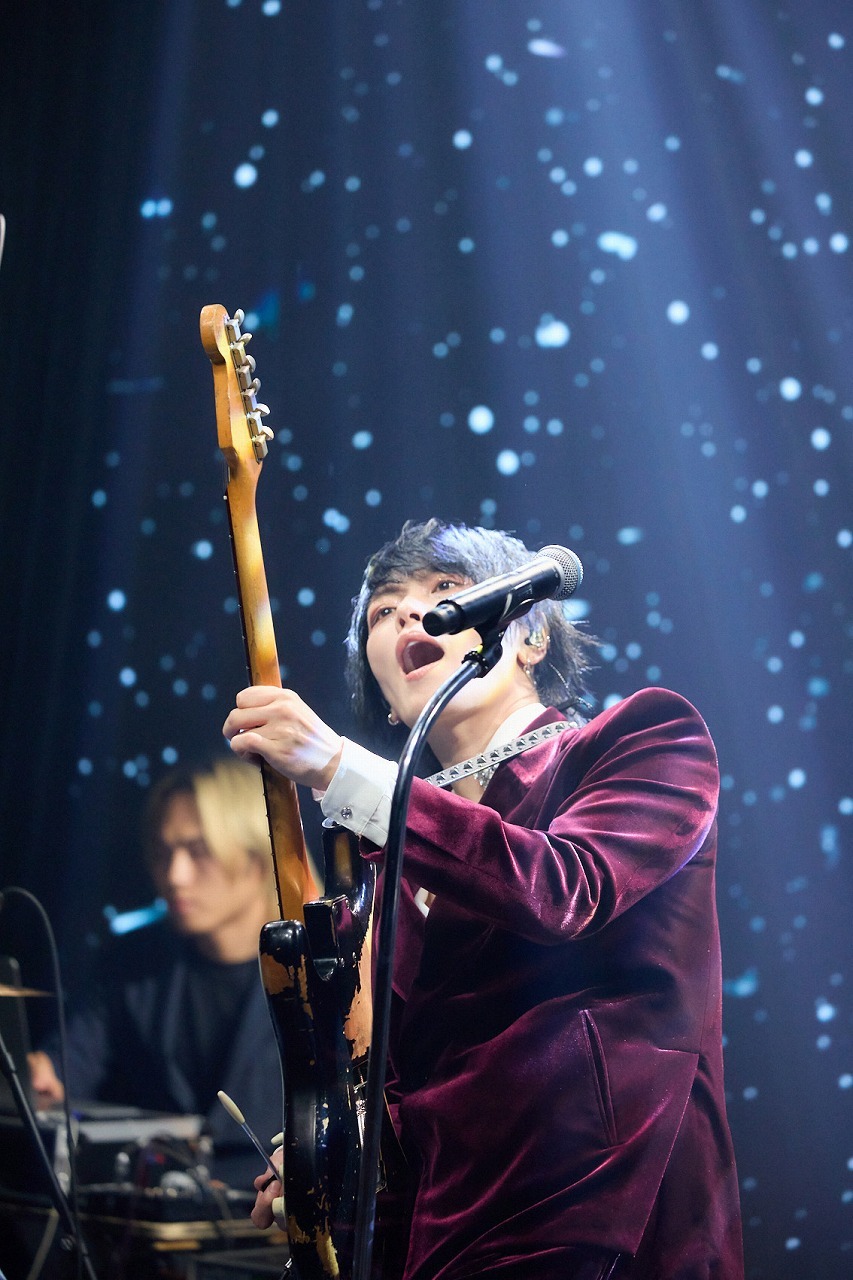 今回の会場となっているGT LIVE TOKYOは、音響、照明に加え、映像までプロ集団がこだわりぬいて作り出したいま注目のライブ空間。2025年、[ kei ]のライブ活動の始まりとなった4月公演のテーマは、ズバリ“Air”(空気)。会場内に足を踏み入れると、そのテーマに合わせたように、心地よい優しいアロマの香りが全身を包んでいく。ステージを覆っていた紗幕が開くと目の前には[ kei ]を中心に、高松浩史(Ba/The Novembers/Petit Braincon)と植木建象(Dr)のリズム隊は上手サイドに、[ kei ]の後方には鬼塚康輔(Sax)、クロサキヒロミ(Piano)が横並びでスタンンバイ。バンドは3人から5人編成に変わっていた。「ETERNAL HEART」からライブがスタートすると、ステージ後方には大迫力の大型ビジョンが登場。そうして、ここからライブ全編に渡って、観客を楽曲のなかに連れ出していくような音、照明とリンクした映像が映し出されていく。「Air」というテーマに合わせて選曲されたセットリスト。それを演奏するサウンドも、バンド編成が変化したことで、これまでシンプルなバンドサウンドに音を重ねて表現していた音圧、奥行き、輪郭はさらに深みを増したものへと進化。ライブ前半、5人が繰り出す生音は、まるで映像が映し出す天空や星空、宇宙へ溶けていくような洗練されたハーモニーを奏で、中盤の「monolith.」などでは、各々の音がアグレッシにぶつかり合い、グルーヴしながらインナー宇宙へと向かって炸裂。モノトーンの映像とともに、オーディエンスをカオスな曲の世界へとどっぷり誘っていくシーンもあった。さらにこの日は、新しくラインナップに加わった白いニューギターを使って歌い、演奏したい曲ということでPrinceの「 Purple Rain」をカヴァーし、ここでは[ kei ]のギターとSaxが圧巻の掛け合いを繰り広げ、その後は2人時代のBAROQUEを牽引した「G I R L」を初めてステージで歌うなど、いままでにはなかった新鮮なステージパフォーマンスでファンを大いに驚かせる場面もあった。