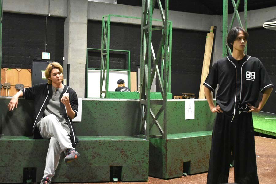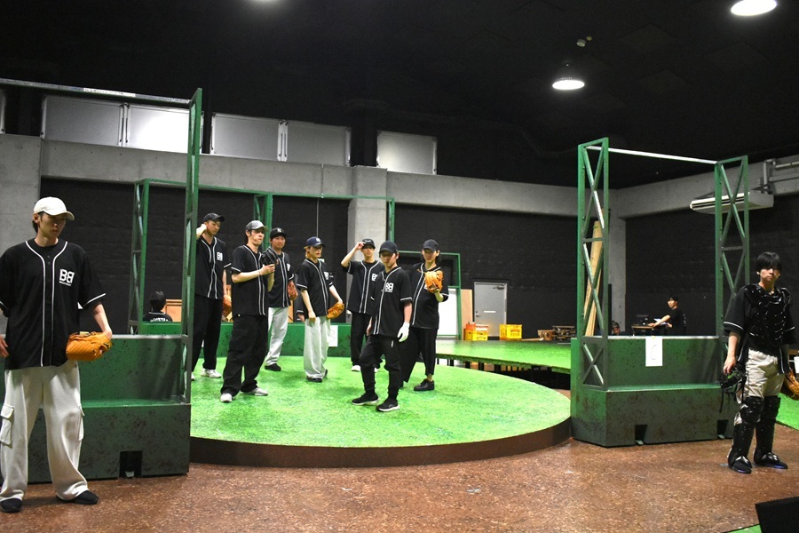 稽古場に組まれていたのは、グラウンドを模した廻り舞台「盆」を中心としたセット。可動式のフェンスがいくつか設けられ、場面転換などに用いるパネルの役割も果たす。キャスト、スタッフが身に着けているのは、揃いのベースボールシャツだ。