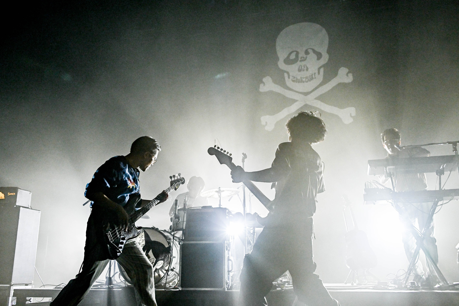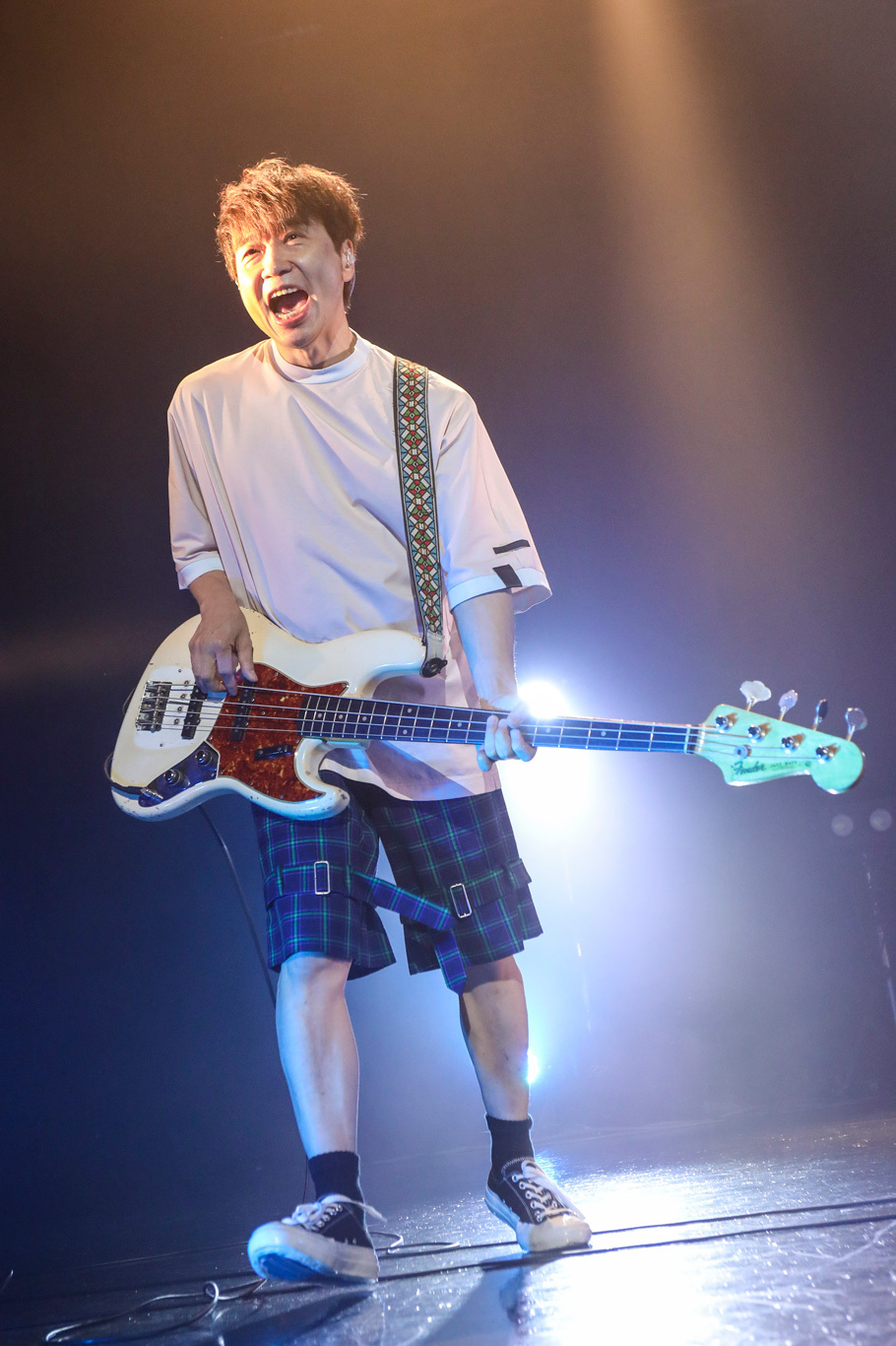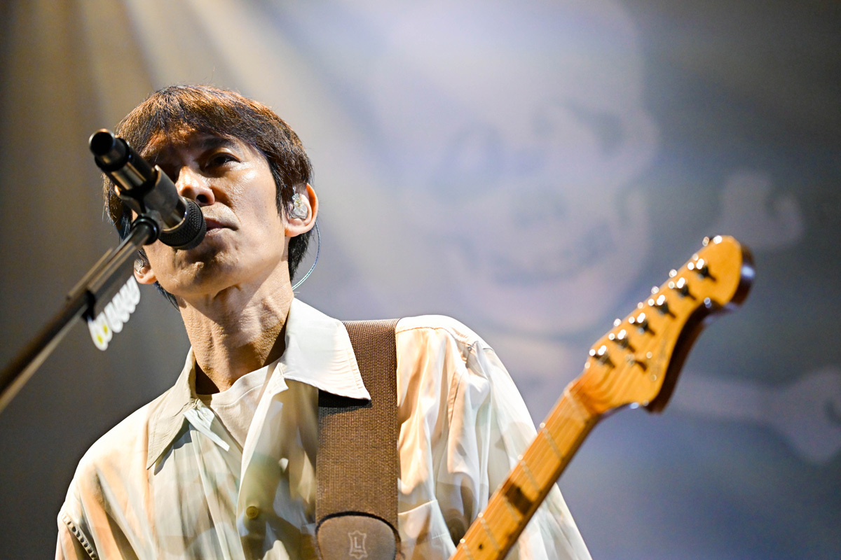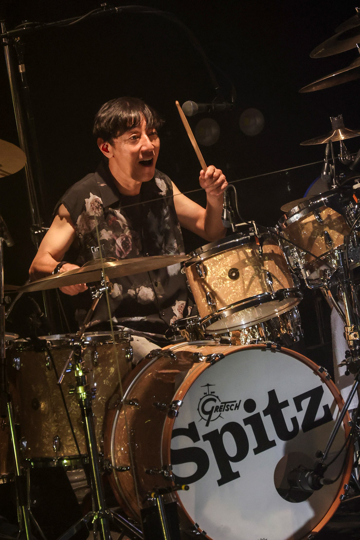 大歓声を受けてトリのスピッツがステージへと登場し、Zepp全体の温度がグッと上がるのを感じるなか、「オケラ」でスタート。三輪テツヤのエモーショナルなフレーズが轟き、「見っけ」ではクジヒロコ(Key)の鍵盤が牧歌的なムードを彩り、胸の高鳴りは増すばかりだ。手拍子で満たされる「テイタム・オニール」では、﨑山龍男の心地良いビートが草野の真っすぐな歌声を何倍にも引き立てていく。ステージを縦横無尽に跳ねる田村明浩(Ba)のエネルギーは、まるで観る者の心を直接震わせるかのよう。彼の一挙手一投足が、全体の空気を生き生きと躍らせる。