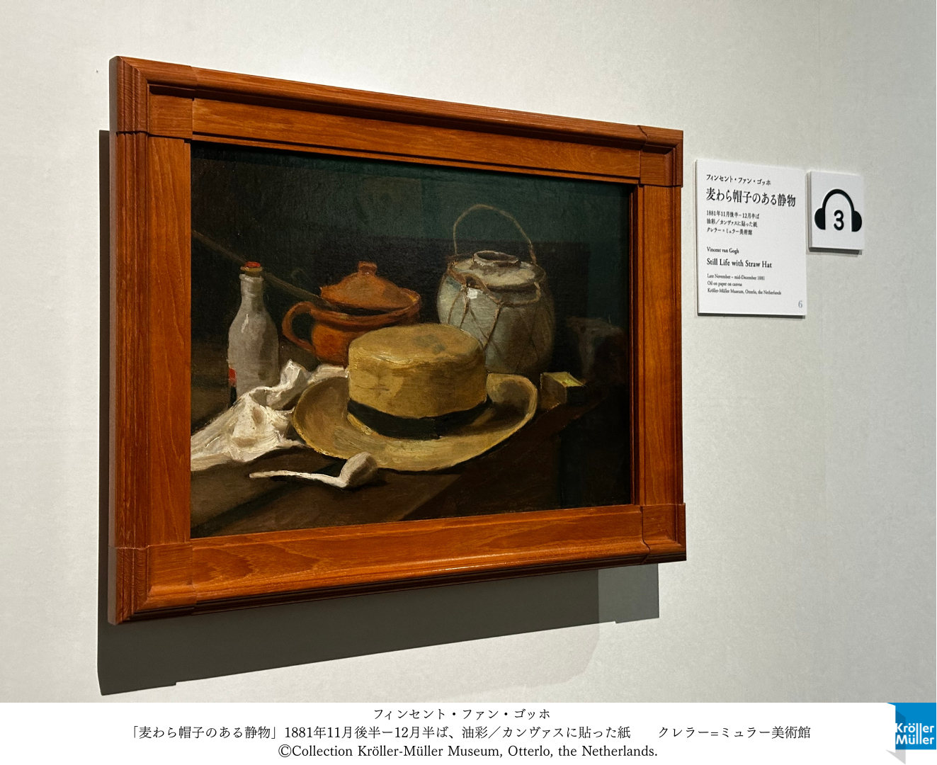 仕事をすることに疲弊し職を転々とするもうまくいかず、27歳になって画家を志したファン・ゴッホ。画家としての道のりは、従姉の夫で画家のアントン・マウフェの指導のもと描き上げられたとされる「麦わら帽子のある静物」に始まる。風景素描の数々からは、自分の身近にある何気ない風景を捉え表現しようと試行錯誤したことがありありと感じ取れた。農民や織工たちが働く姿、彼らの表情を真っ直ぐに捉えた作品群(中でも「白い帽子をかぶった女の頭部」や「パイプをくわえた男の頭部」など「頭部」シリーズ作品は、ファン・ゴッホが初めて傑作と称される「じゃがいもを食べる人々」の前触れとなっている)など作品を見ながら歩みを進めるごとに、自分らしい表現を模索しながら描き続けるファン・ゴッホの心情が見えてくるとともに、クレラー=ミュラー美術館のコレクション力にも舌を巻く。