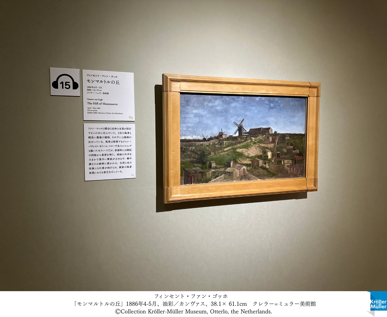 この章でまず目を奪われるのは「モンマルトルの丘」だ。ファン・ゴッホが住んでいた、都会と田舎の風景が混沌としていた場所を描いたもので、第2章で展示されていた重い印象の作品群と比べると鮮やかさを帯び始めていることがよくわかる。パリの街や印象派の画家たちから新しいインスピレーションを得て自分なりの表現を見つけつつあったのではないだろうか。