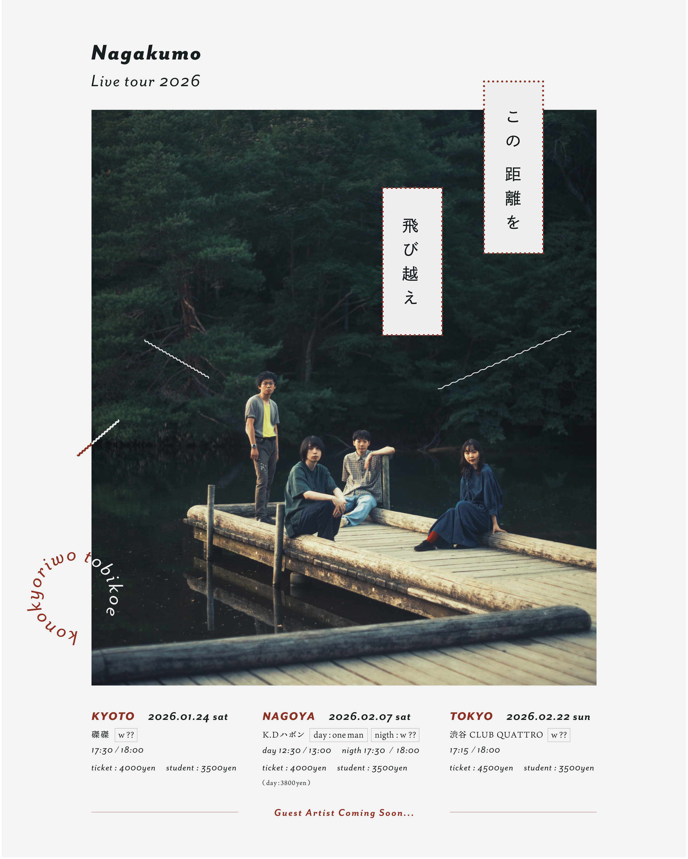 来年1月からは全国3箇所を周るツアー『Nagakumo Live Tour 2026 “この距離を飛び越え”』の開催が決定した。地元関西の京都・磔磔から始まり、愛知・KD ハポン(昼夜公演開催)、ツアーファイナルは2月22日(日)にバンド最大規模の渋谷クアトロでのライブとなる。GUEST BAND をご招待してのライブとなるので(※KD ハポン昼公演のみワンマンライブ)、今後の発表も要チェックだ。