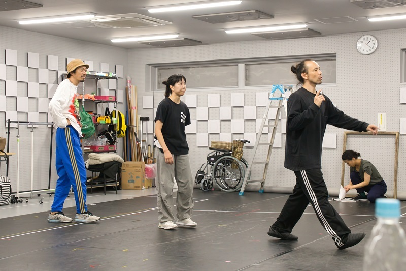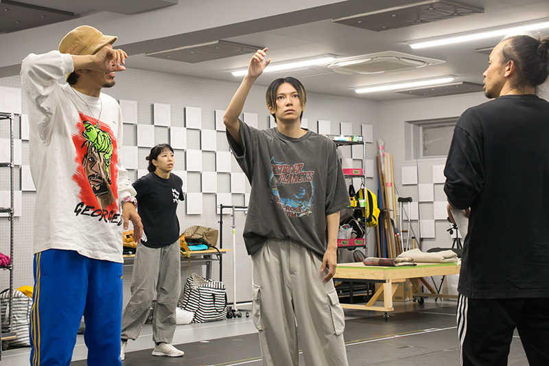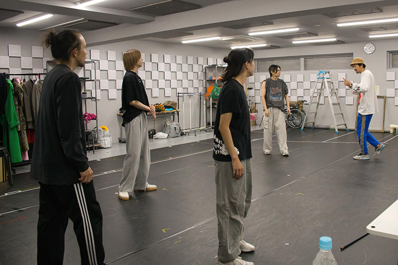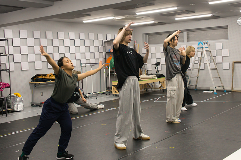 この日は振付日。2020年東京オリンピックの開会式と閉会式でDirector of Choreography(総合振付家)を務めたことでも知られる平原慎太郎が、冒頭のシーンから順に各登場人物の動きをつけていった。平原と丸尾はこれが初タッグ。稽古が始まる少し前から、「いくつかアイディアを持ってきました」と平原が丸尾の元へ。短時間のやり取りではあったものの、互いの考えを共有しながら作品に落とし込むものをすり合わせていく、実にクリエイティブな瞬間を垣間見ることができた。