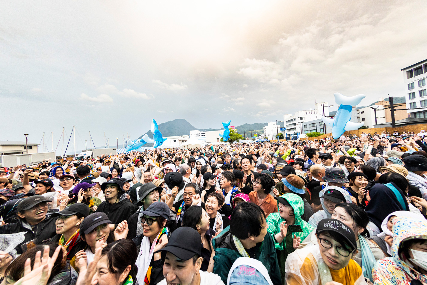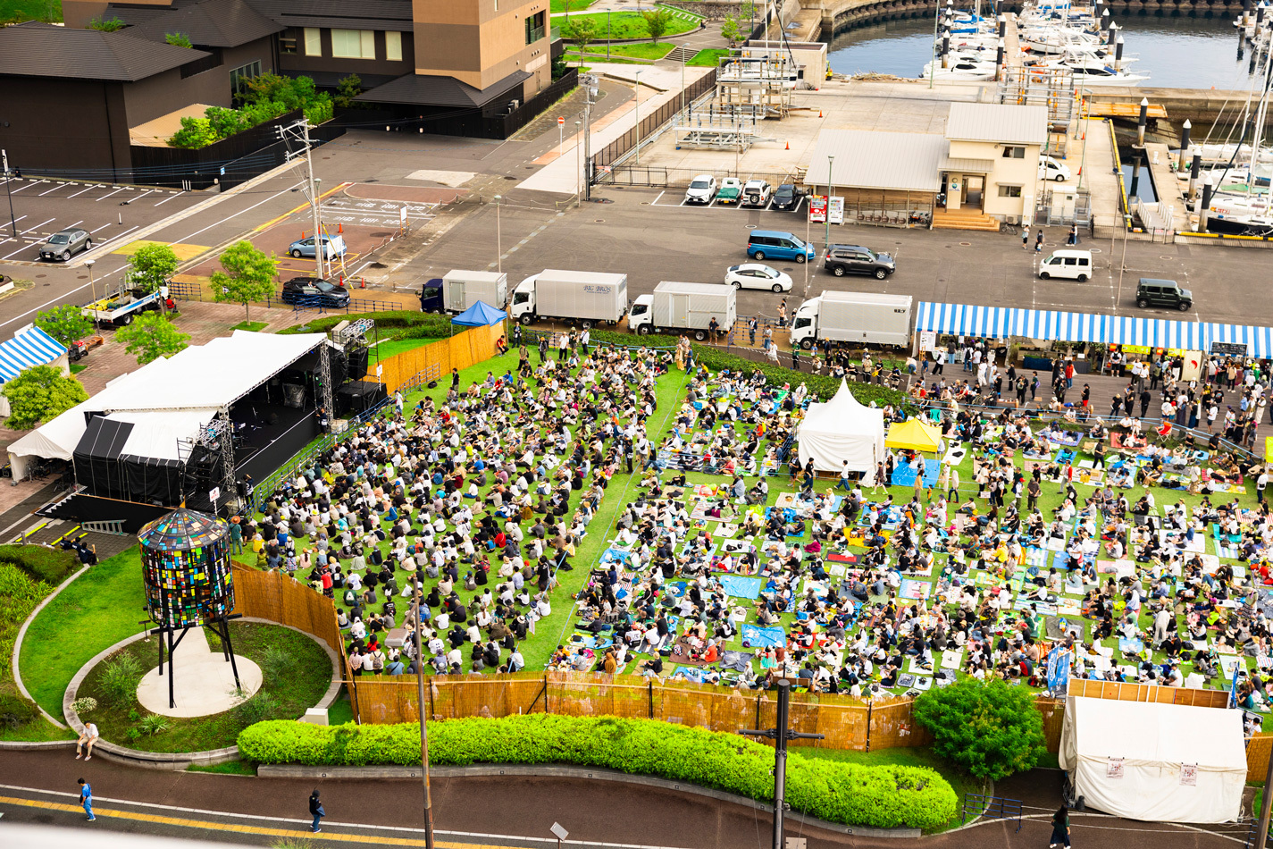 北浜公園は別府駅からも徒歩すぐの街中ど真ん中にあり、別府湾や高崎山を一望できる。真横は道路であり、ホテルや商業施設に囲まれて、普段は街の催し物などをやる縦長でコンパクトな公園。或る意味、都市型フェスだが、そこまでたいそうなものでもなく、気軽気楽なお出掛け感覚であり、観客も緩やか穏やかに楽しんでいる。全国各地あらゆる野外フェス・野外イベントに出向いているが、こんなに街に溶け込んで、ギュッと密集したものは初めて。このスモール感がちょうど良い。主催者に聞くと、約10年前に別府を訪れた際、宿泊したホテルから北浜公園の景観を観て、いつか野外イベントを開催したいと思ったという。