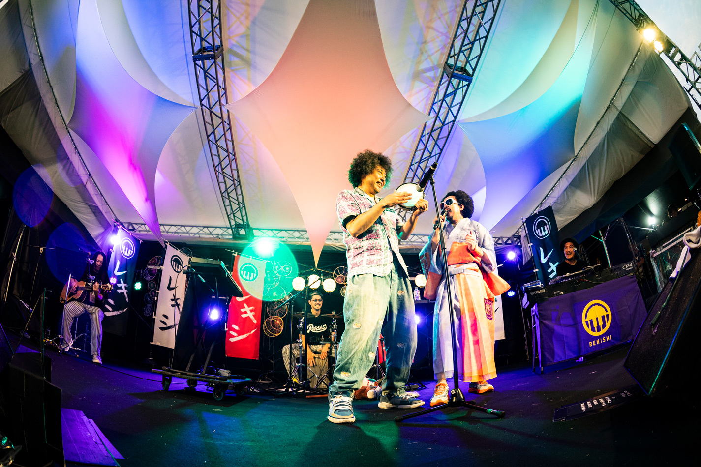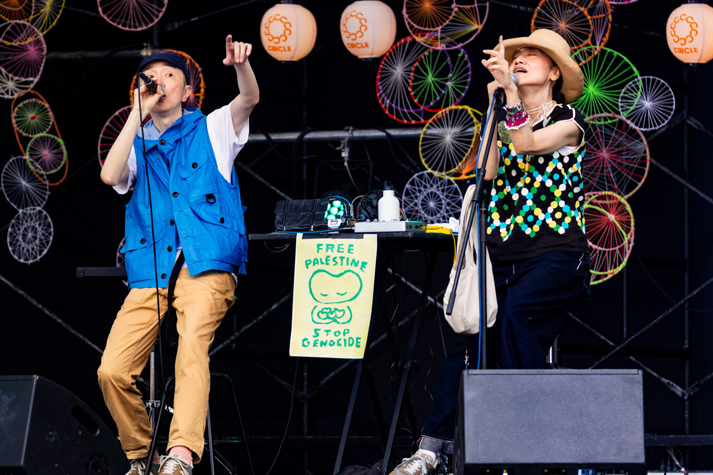 『CIRCLE』出演も10年ぶりであり、そんな特別な時間には、レキシネームがニセレキシのU-zhaanも引っ張り出されて、カンジーラとの即興演奏で「RYDEEN」を謎の替え歌で歌う! ジャーマンテクノばりに、スクエアプッシャーばりに、U-zhaanのカンジーラが高速で繰り広げられ、そこにのせて池田は90年代の大ヒット曲を歌う。楽しみながらも最後まで、そんな感じかなのかと想いつつも、最後は「狩りから稲作へ」を歌いながらの無事着地。ずっと観客たちは稲穂を振っている熱狂興奮状態であったし、ライブが終わった頃には完全に雨はやんでいた。