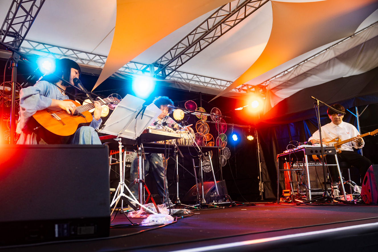 3人それぞれの曲が披露されていくが、メールで「何の曲やる?」「坂本(龍一)さんの曲やらない?」とやり取りされて決まったという「テクノポリス」へ。可愛らしくもあり壮大なアレンジであったが、U-zhaanも驚いていた様に、何も声色を加工することなく、歌いきった青葉には驚愕するのみ。また、U-zhaanと青葉の朗読劇が微笑ましい「川越ランデヴー」から、青葉が「いっちょ晴らすか! 雨を晴らすか!」と「太陽さん」へ。終わり、「若干、雨強くなったんじゃない?」とU-zhaanは笑い、青葉との軽妙なやり取りをはさみ、最後は細野晴臣のカバーで「悲しみのラッキースター」へ。<雨の中 どこに行こう>という歌詞が、まさに今の天候にフィットして、雨とはいえ心よい感情で聴き終えられた。