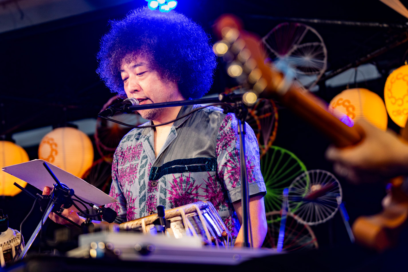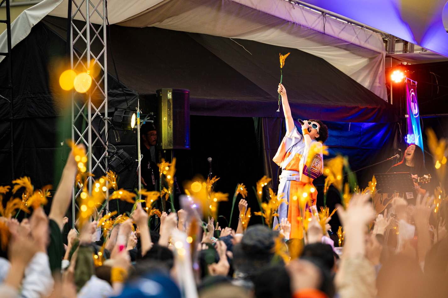 「別府の空を見上げると、一面の星ではなく武士」という流れから、1曲目「きらきら武士」へ。舞台が雨で滑るか滑らないかを端的ながらも入念にチェックするという本来は全く必要ない場面も楽しんで観れてしまうのだから、池田のエンターテイナーっぷりは素晴らしい。別府温泉というコール&レスポンスからドリフターズ「いい湯だな(ビバノンロック)」の一節を歌うというお調子者モードに魅せられながら、気が付くと池田は鍵盤を掻き鳴らす本気モードも魅せる。それも通常の大所帯では無くて、鍵盤・カホン・アコギという4人の少数精鋭部隊。コンパクトなステージでコンパクトな編成なのに、いつもと変わらない威力を放つというインパクトのデカさ……。いつどこで誰とやろうとも何も変わらないインパクトの凄みに拍手を送るしかない。