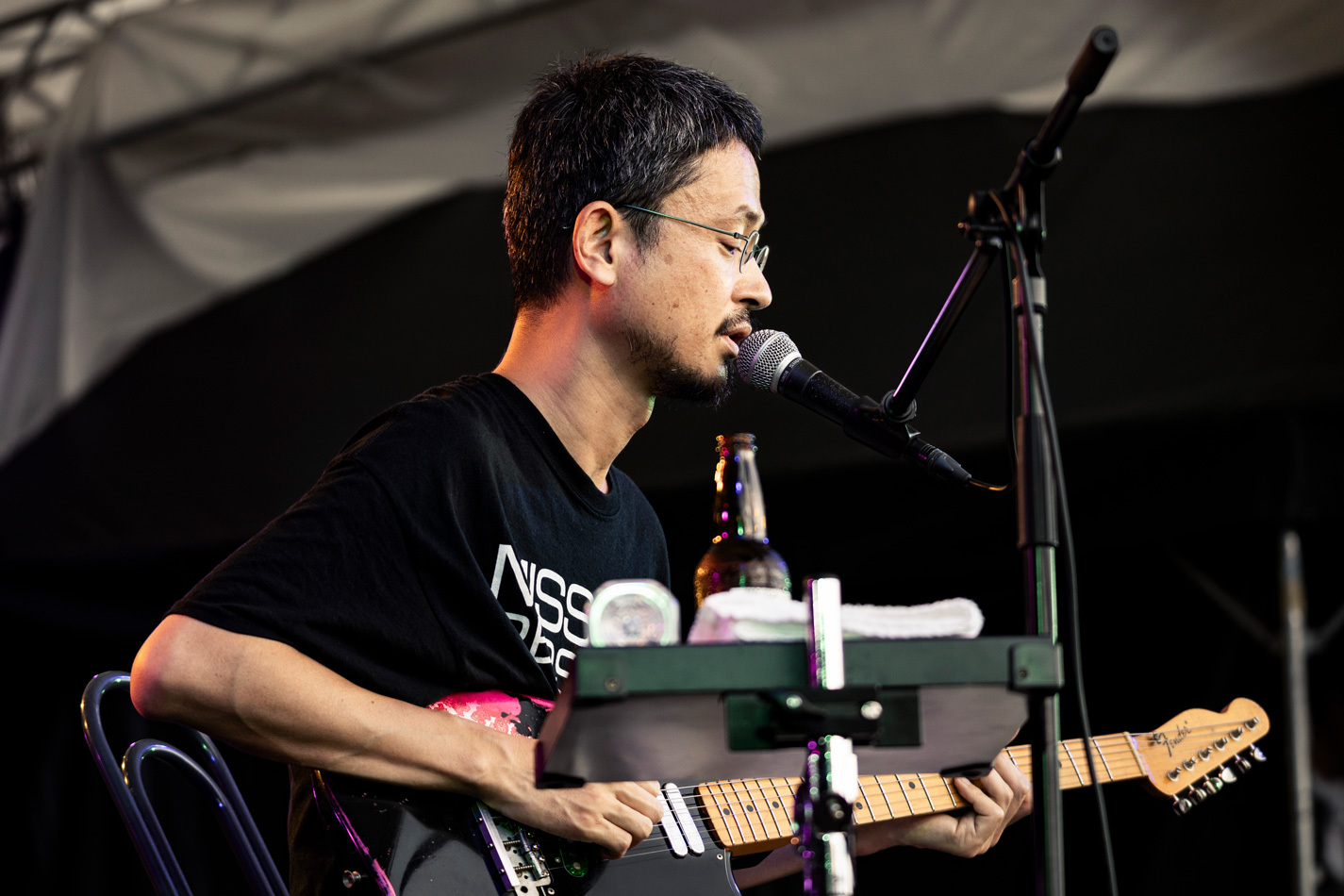 3組目は長岡亮介。サウンドチェックからOriginal Love「接吻」を歌い、観客は総立ちで聴き、黄色い声援が飛びまくる。田島貴男を真似て歌い、「田島のオジキに怒られる!」と茶目っ気たっぷりな長岡。曇天の空模様だが、そんなの関係無しで楽しめる。いざライブが始まるとギターの音色が幻想的で、もしも白昼夢なんていう言葉を使うならば今かも知れないという雰囲気。「湖畔」もゆらゆらしながら安穏な気分で聴ける。