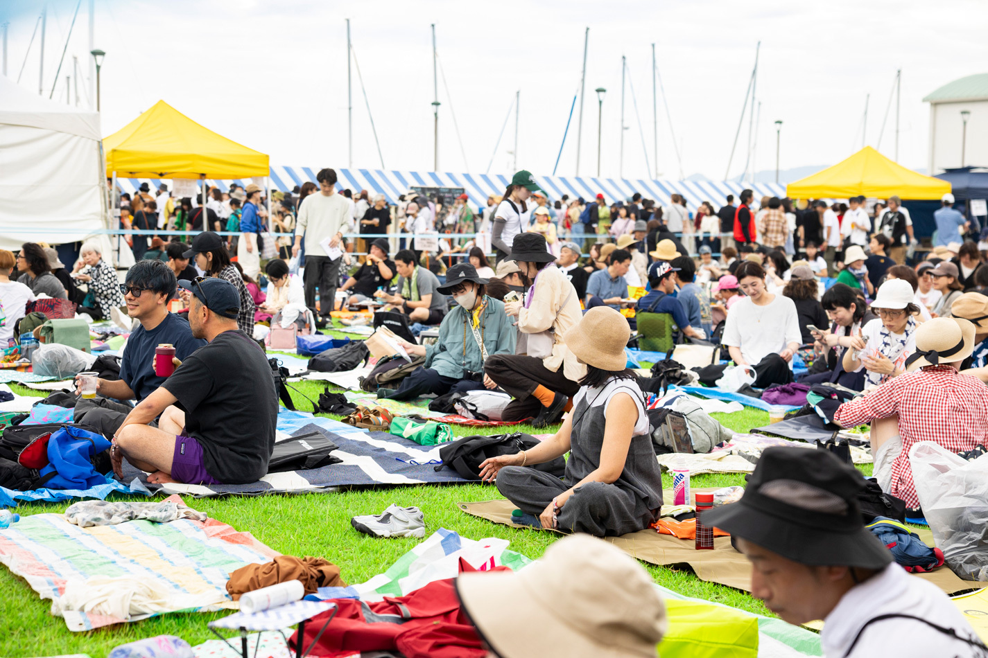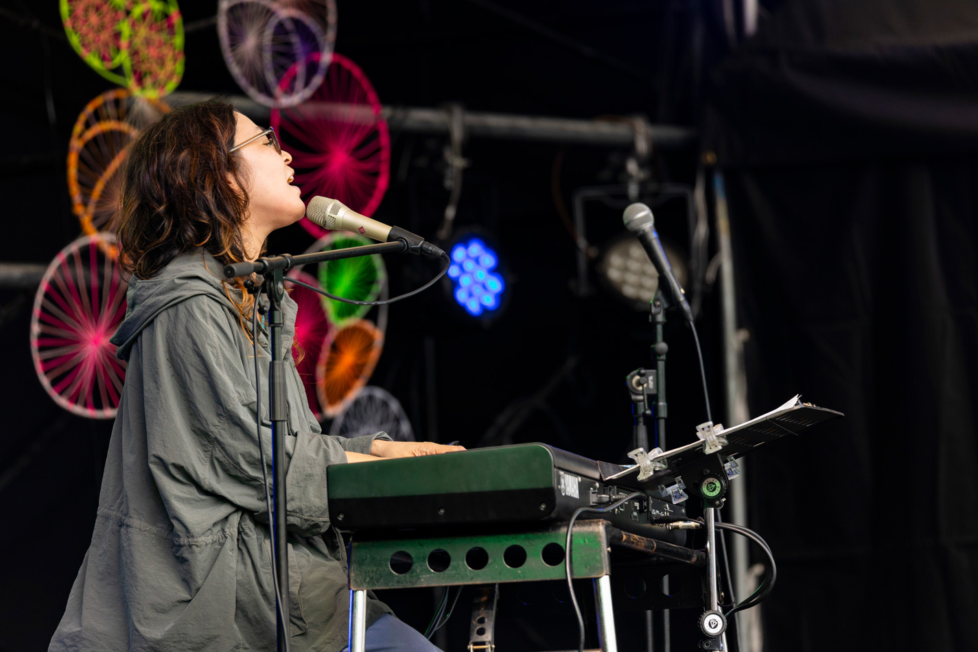 1組目はSmall Circle of Friends。九州出身のムトウサツキとアズマリキによるふたり組だが、出演が発表された時に、こんなにぴったりなミュージシャンはいないなと感激した。ムトウも「イベント名を言われる度にドキッとしているのよ」と笑っていた。ふたり共に少し高めの椅子に腰かけて、ふらっと来たようなリラックススタイル。オープンエリアという敷物をひかず基本は立って観るエリアでも、ほとんどの観客が座って、こちらもリラックスして観ている。気持ちの良いトラックにふたりの歌とラップが乗っかる「からっぽ」をぼんやり観ていたら、アズマも「すっごい気持ち良くてぼんやりして」と言っていたので、あながち間違いじゃない感覚だったのだろう。別府温泉が有名なこともあり、大分空港でも足湯を見かけたが、歌う方も観る方も足湯をしているみたいな、そんな感じかも知れないとふと勝手に思う。この身近な距離感は独特である。(ちなみに後日談によると、かつてこの北浜公園の場所は砂浜だったそうで「砂湯」があったとか。感じた独特の雰囲気は、その頃の名残りだったのかもしれない)