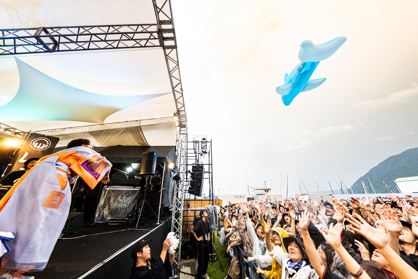 自分はケビン・コスナーだという自己紹介から、ありとあらゆるカバーをぶっ込んでいくスタイルも通常通りで、すっかり観客たちは雨を忘れているし、いつのまにやら雨もやみそう。羽織も脱いだと思いきや、十二単に着替えようとするが、そこも一筋縄にはいかず、90年代の珠玉のコント「MR. BATER」ワンシーンも盛り込まれたりと、ずっと一筋縄ではいかないし、「KMTR645」では、イルカのビニール浮き輪が「別府の海に帰してやってください!」と言い放たれて、観客の上を飛び交っている! 本人いわく「椅子の上に座って落ち着いてやりたかった!」とのことだが、これがレキシスタイル!