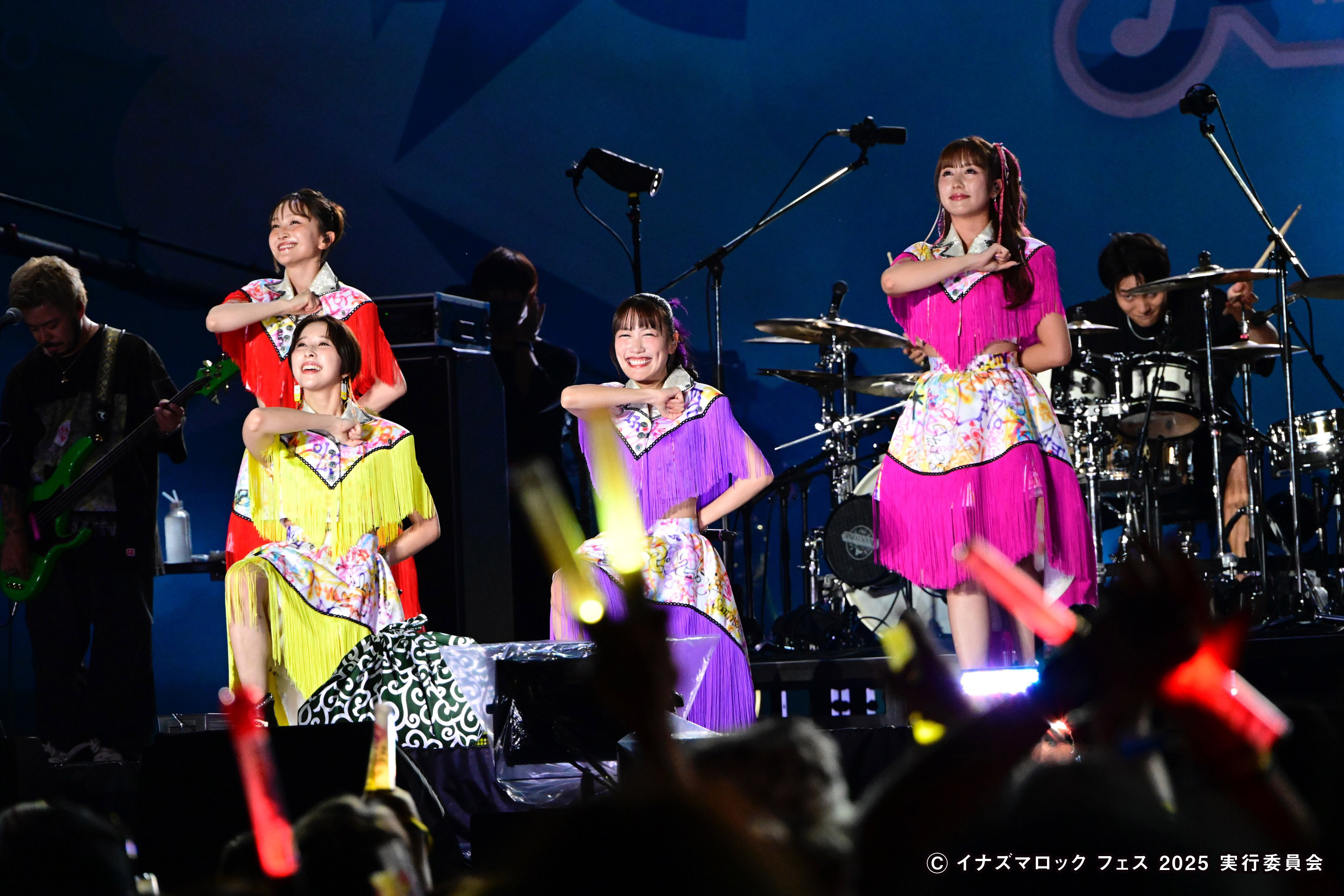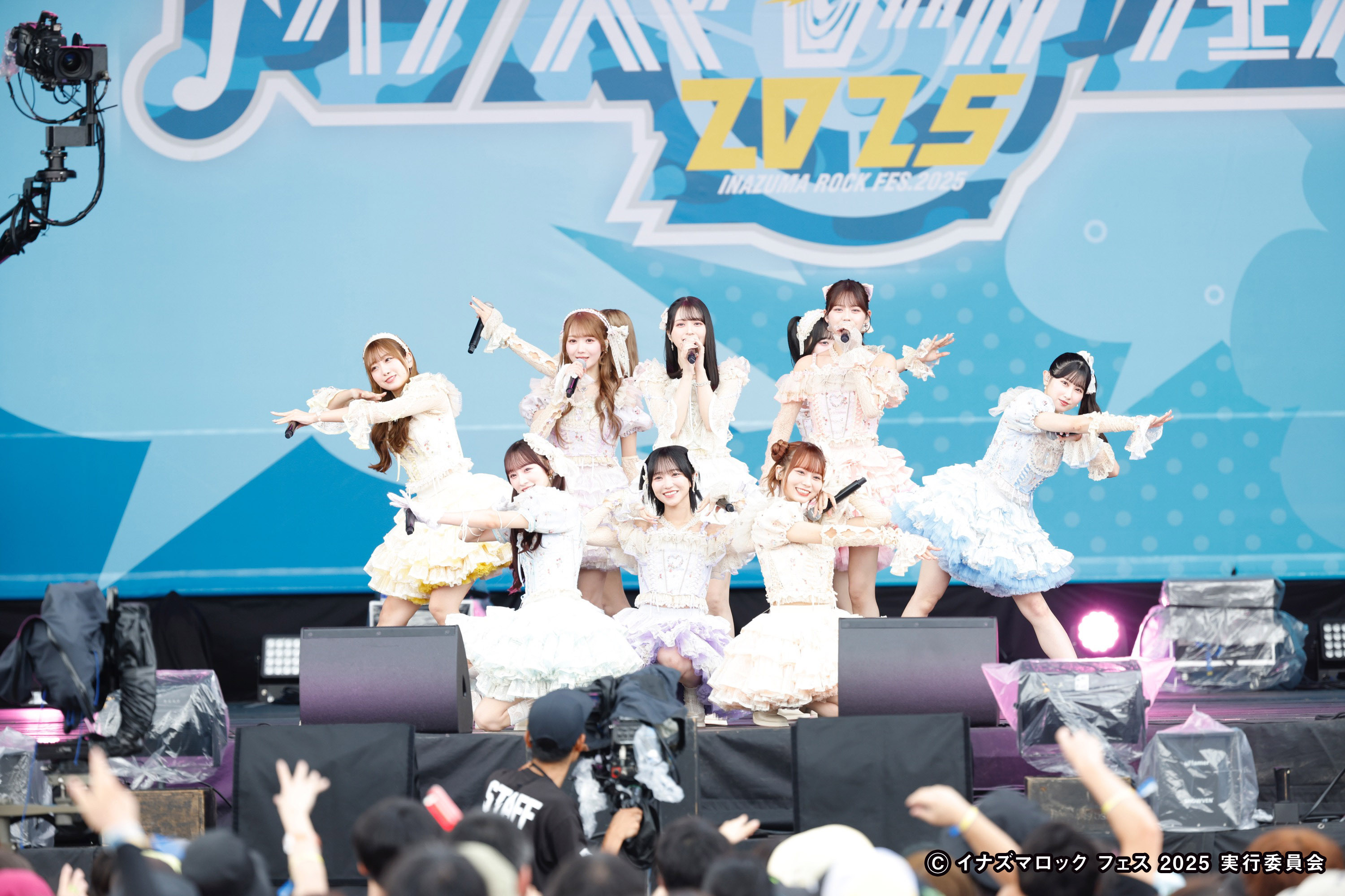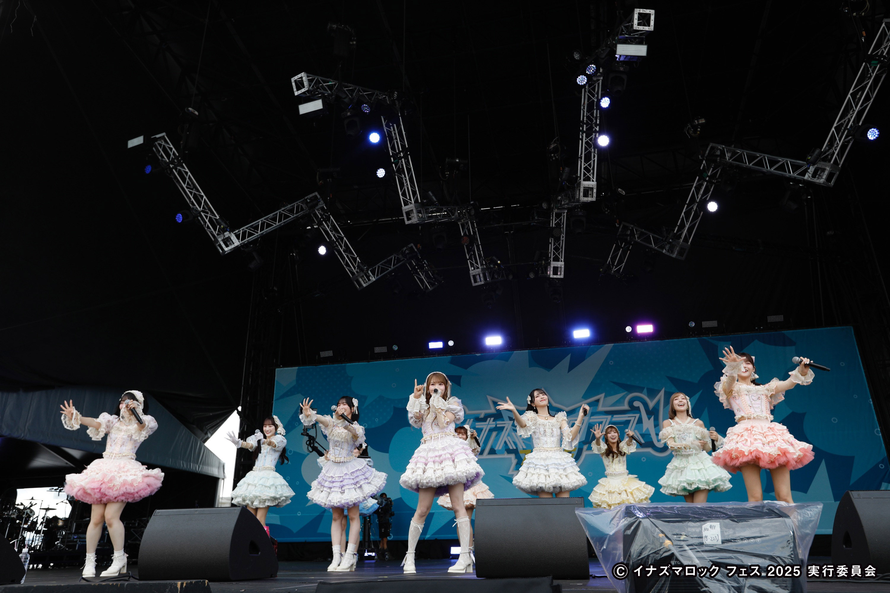 「超特急逃走中」では歌割りもダンスも個性を活かした構成で、フィールドのあちこちから「可愛い!!」と歓声が上がる。“イコラブ”“イナズマ”コールで盛り上がる会場に、「いらない ツインテール」では拡声器を使った煽りでロックフェスらしいハードな一面も披露。「Oh! Darling」ではタオルを振り回し、「この空がトリガー」ではライブアーティストとしての風格を感じさせる堂々としたパフォーマンスを展開。ラストの「とくベチュ、して」では、王道かつスイートなアイドルソングで最大級の“可愛い”を振りまき、観客を夢中にさせた。