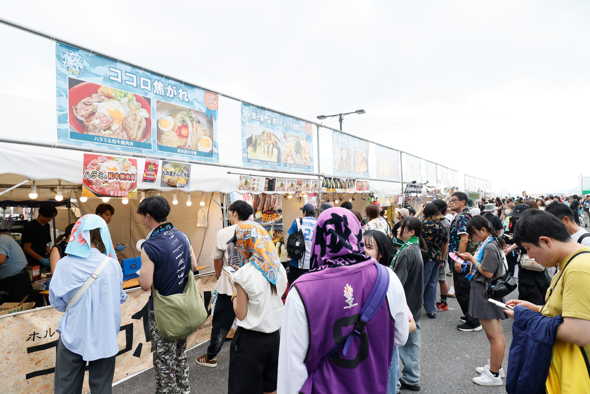 無料エリアはライブだけでなく、フードエリアの充実ぶりも目を見張るものがある。観客からは「『イナズマ』はフェス飯の概念がぶっ飛ぶほど美味しいグルメがそろっている」「滋賀の美味しいものが一度に味わえる!」と興奮気味の声も。近江牛、しじみ、サラダパンなど滋賀の名産に加え、毎年開催される『イナズマフードGP』では、全国から選りすぐりの飲食店が出店し、その味を競う。グランプリ店や歴代の人気店が軒並み出店し、焼き小籠包、ハンバーガー、牛タン、博多もつ焼きそばなどが並ぶ。