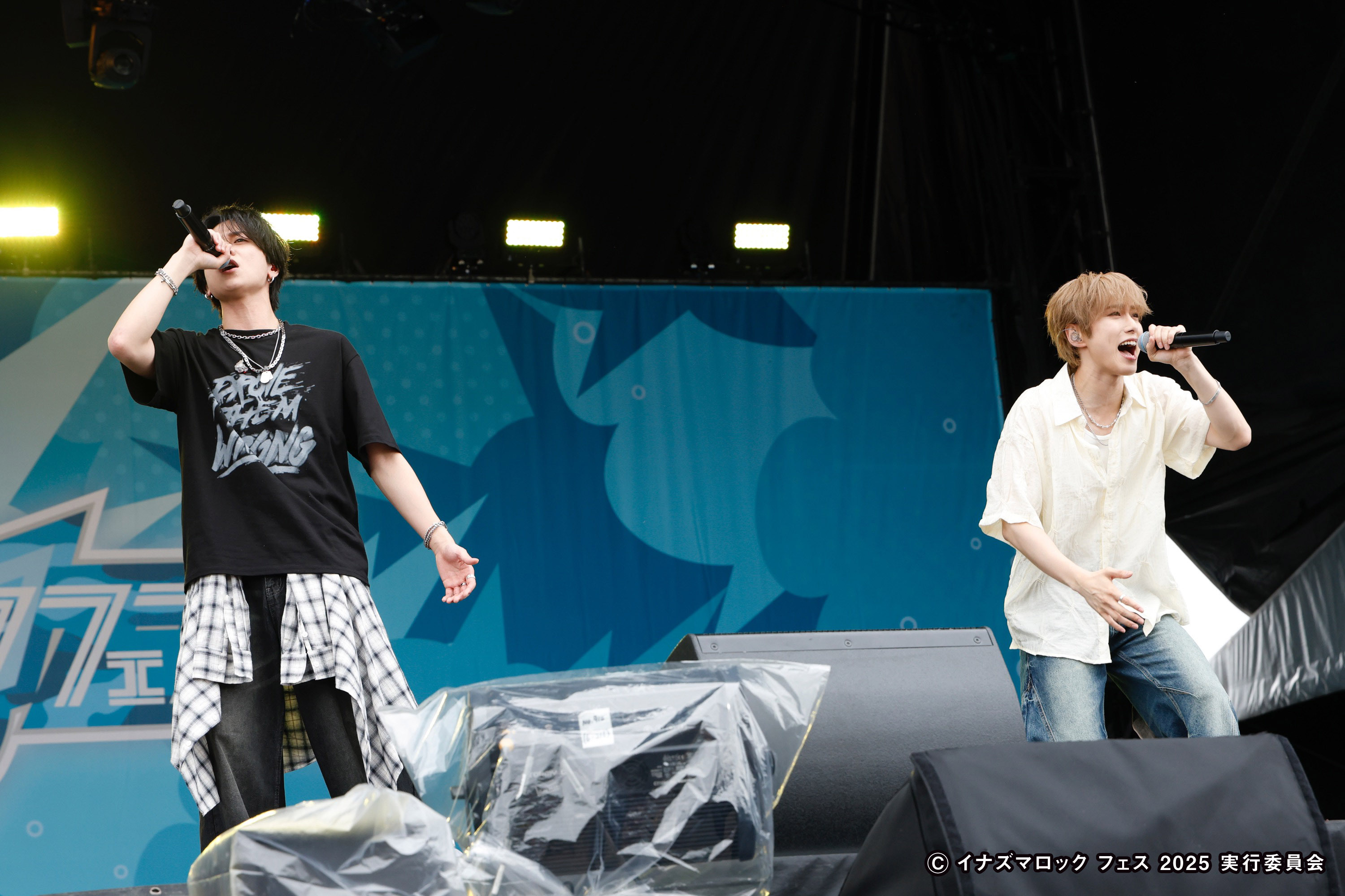 初日となる9月20日、「雷神ステージ」のトップバッターを務めたのは、11人組グローバルボーイズグループ・INIから、ボーカルメンバーの尾崎匠海と藤牧京介の2人。まずは「HERO」をアカペラで披露し、初出演となる『イナズマ』にインパクトを残すべく、2人の歌声の魅力を存分に届けた。「最高に盛り上げて帰りたい!」と語り、「Don’t Worry」ではダンサーを引き連れ、心地よく鳴るビートの中、緩急をつけたダンス&ボーカルで互いの個性を際立たせた。