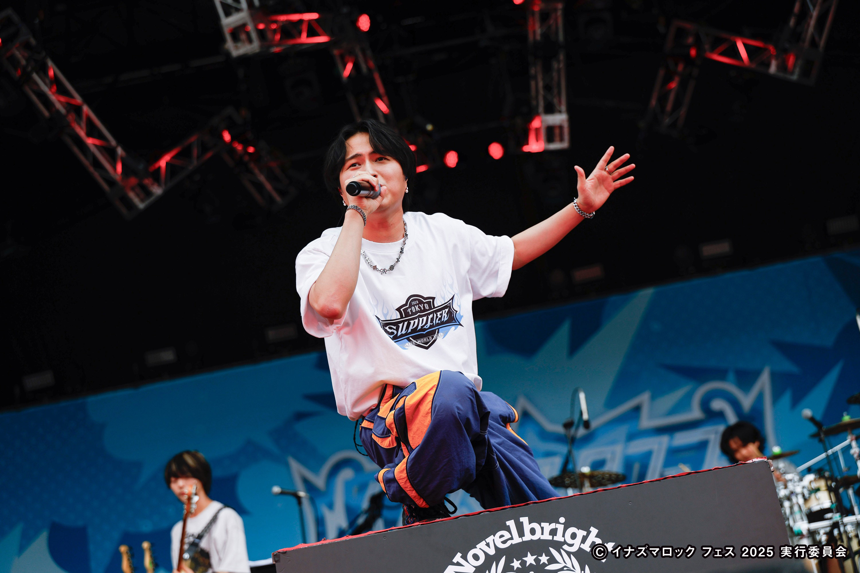 今年で3度目の出演となるNovelbrightは、“イナズマファミリー”としてもすっかりお馴染みの存在。ステージ出演は3度目だが、過去には風神ステージへの出演をかけたオーディションに応募した経験もあり、彼らの『イナズマ』への思い入れはひとしお。サウンドチェックからT.M.Revolutionのカバー曲を披露するなど、序盤からフィールドを盛り上げ、「Sunny drop」では曇天を晴らすようなアッパーなギターサウンドで心地よいスタートダッシュを決めた。