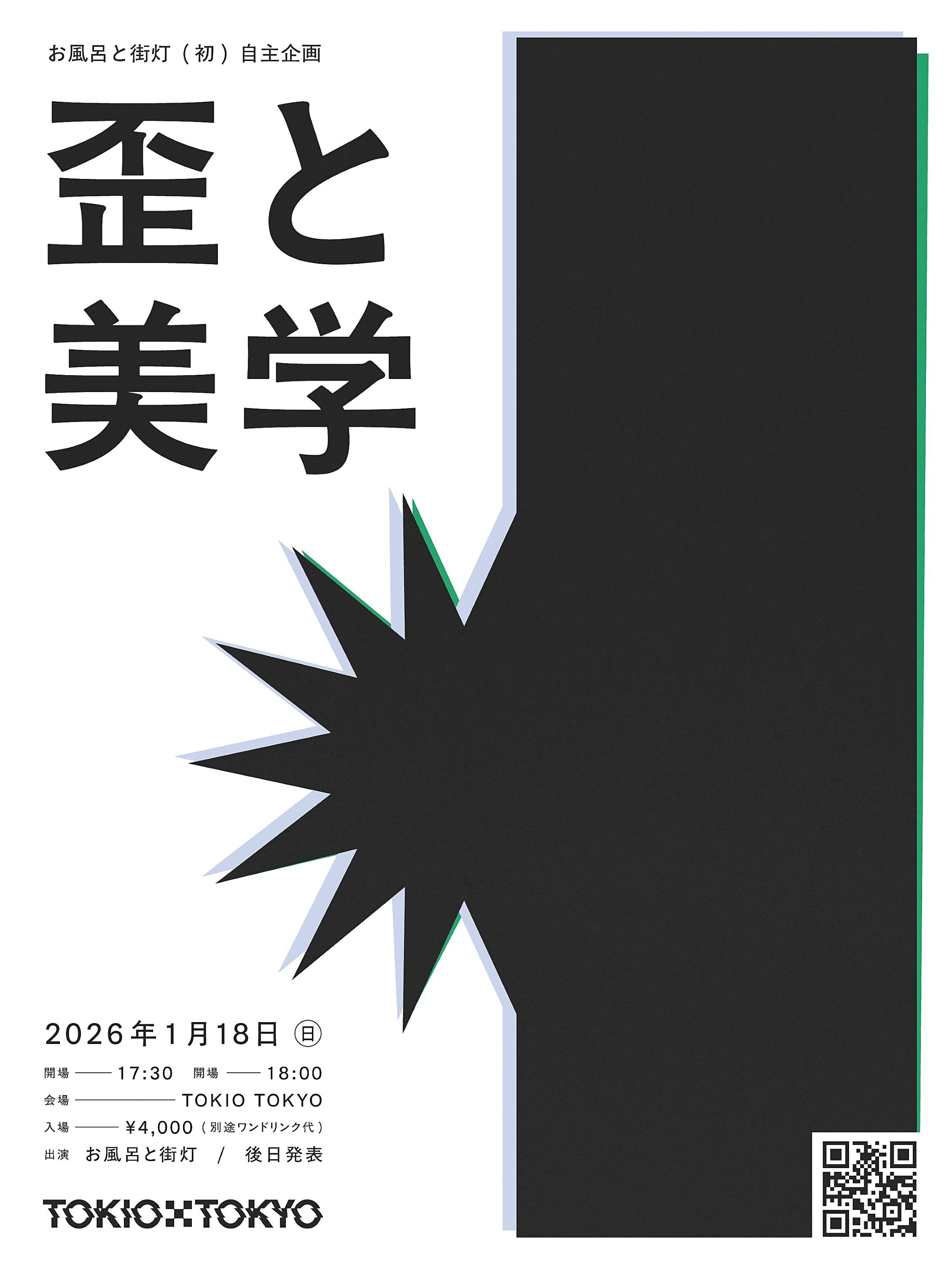 さらにお風呂と街灯初の自主企画『歪と美学』も発表された。お風呂と街灯が共演を切望するアーティスト2組を迎えて開催される。共演者は後日発表。