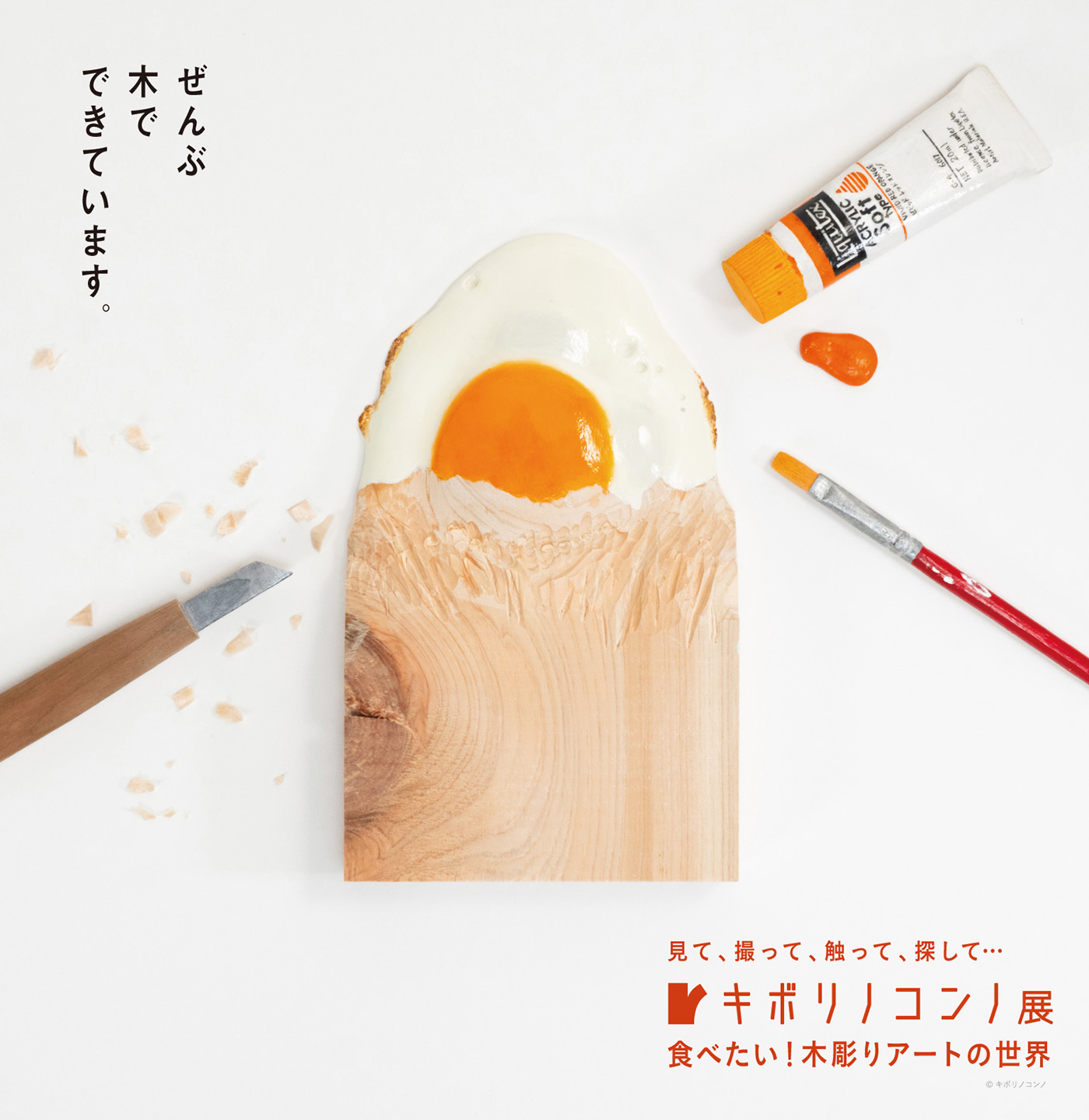 本物そっくりな食べ物や、透明に見える生卵など、あっと驚くキボリノコンノ氏の木彫り作品が勢ぞろい。本物の食べ物に混ざった木彫り作品を探し出すクイズもあり、子どもから大人まで楽しめる内容になっている。