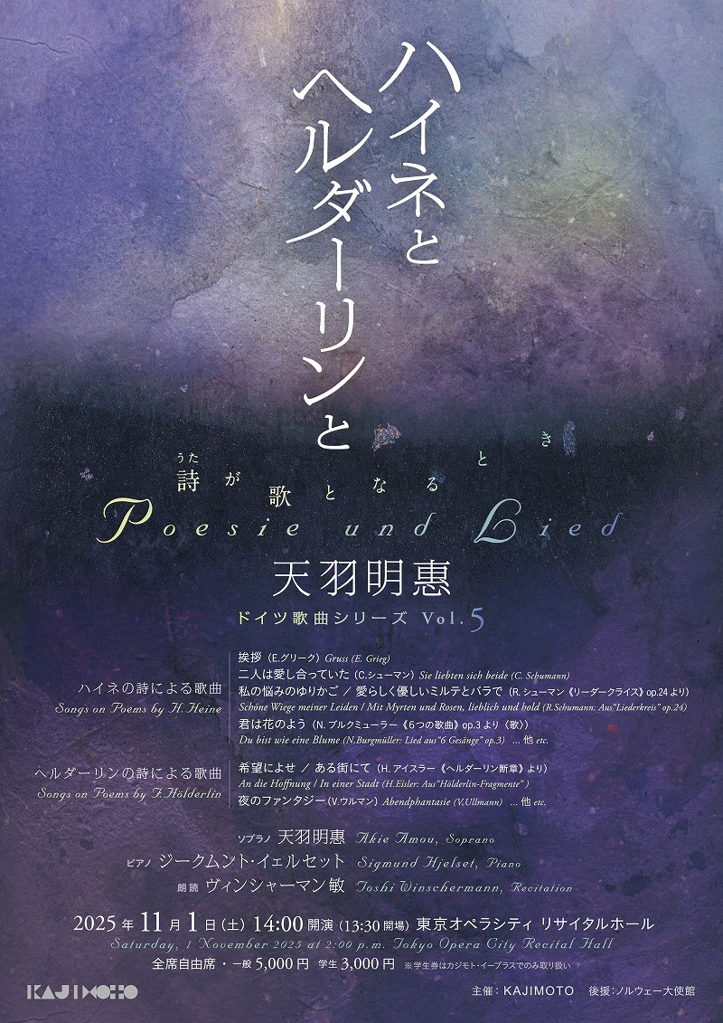 2025年11月1日(土)東京オペラシティ リサイタルホールにて『天羽明惠 ドイツ歌曲シリーズ 詩(うた)が歌となるときVol.5「ハイネとヘルダーリンと」』が開催される。