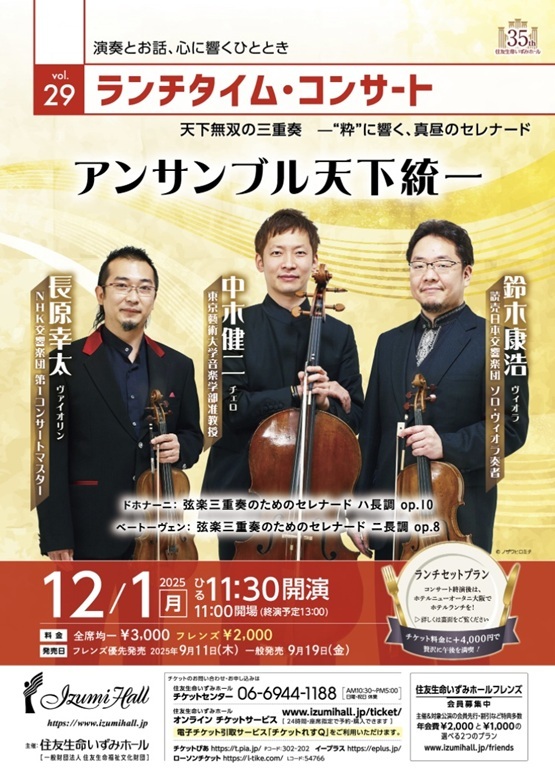 住友生命いずみホールは大阪フィル時代、何度も演奏しました。ホームのフェスティバルホールやザ・シンフォニーホールと比べると少し小ぶりですが、全てにおいて素晴らしいホールです。そのホールで「アンサンブル天下統一」が演奏させて頂くことになりました。今回主催者からは、お昼時の少し軽めのコンサートとお聞きしていますが、曲は2曲とはいえ、中身の濃いコンサートになりそうです。ドホナーニとベートーヴェンの「弦楽三重奏のためのセレナード」の聴き比べ。貴方はどちらの曲がお好きですか? ぜひ音響の素晴らしい住友生命いずみホールで、僕たちの生演奏をお聴きください。皆さまのご来場を待ちしています。