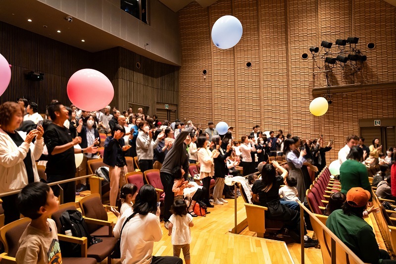 と、突然おどろおどろしいメロディが流れてきます。「魔王だ! そらくん、逃げよう!」とたくみお兄さん。歌曲で名高いシューベルト「魔王」を、ピア兄がピアノソロで熱演。圧倒的なスケール感に包まれ、ホール中が劇的なサウンドに震えました。演奏が終わると、たくみお兄さんが「みんなで鬼のパンツを歌って、魔王をやっつけよう!」と声をかけます。大人も子どもも立ち上がり、みんなで踊りながら「鬼のパンツ(フニクリ・フニクラ)」を笑顔で熱唱!会場にはパステルカラーの風船が舞い上がり、大興奮のままエンディングを迎えます。音楽を聴くだけでなく、みんなで楽しむ“参加型”のコンサートは、これまでの公演とはひと味違う盛り上がりを見せました。温かい一体感に満ちたフィナーレでは、たくみお兄さん、ピア兄、そらくんが揃って観客に向かって元気に手を振り、ステージをあとにしました。