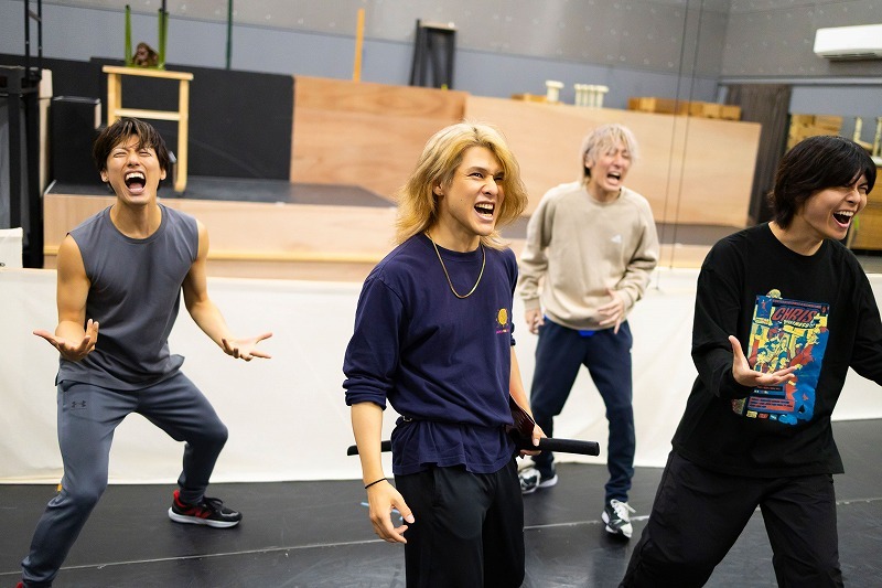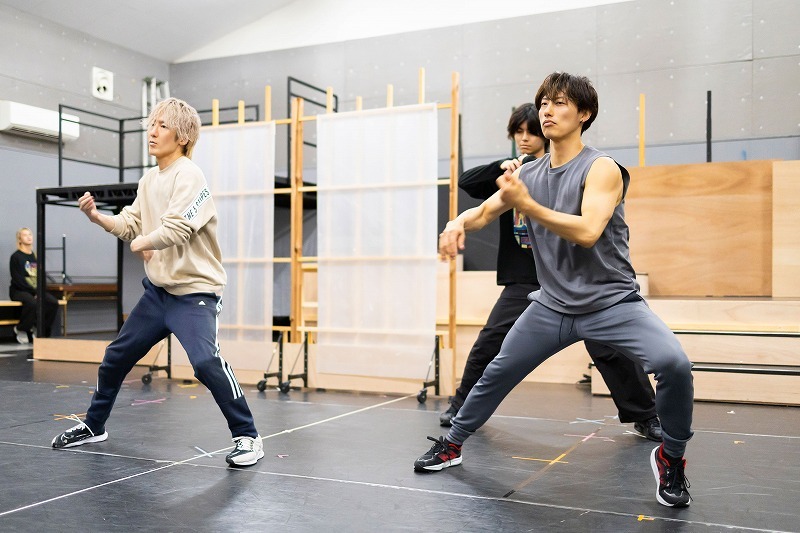 稽古場では、衣裳つき通し稽古を前に殺陣返しが行われていた。手数が多く、その上、セットの移動も多い。お互いにカウントを取り合いながら、殺陣の動線やセットを動かすタイミングを細かく調整していく。キャストが梅棒のみということもあり、作・総合演出を手掛ける伊藤今人からの指示や、キャスト同士の声掛けは驚くほどシンプルだ。「ここ、こっちね」といった一言で、詰まっていた動きが一気に流れる。全員が同じ完成形を共有しているからこその呼吸の合い方だ。改めて、梅棒というチームの“同じ方向を向いて面白いものを作る力強さ”を感じた。