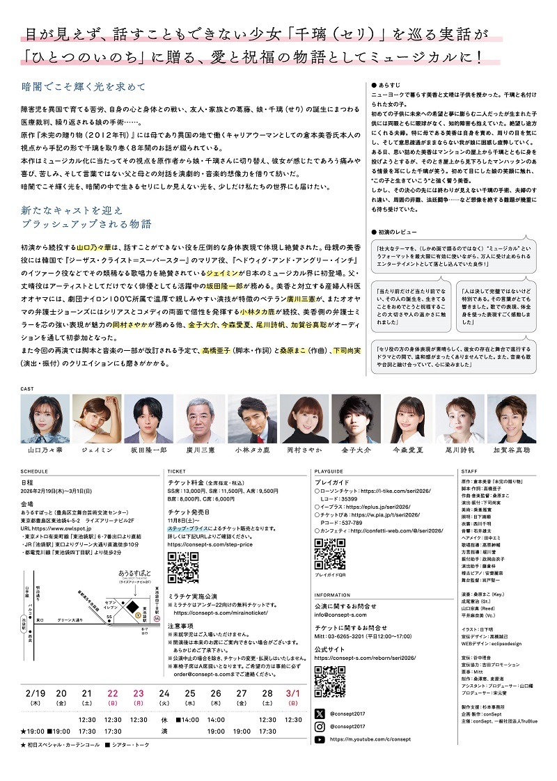 本作は、倉本美香『未完の贈り物(2012年刊)』原作で、『いつか~one fine day』『GREY』に続くconSeptのオリジナル・ミュージカルとして2022年に初演。「多様性の暗闇に光を当てる」をテーマに、目も鼻もない状態で生まれた少女・千璃(セリ)と母・美香をめぐる実話を、ひとつのいのちに贈る愛と祝福の物語として紡ぎ、好評を得た。200人の現地観客から「いつかブロードウェイでも上演して欲しい」とラブコールを受けた2023年のニューヨークでの上映会を経てブラッシュアップ、2026年版の新バージョンとして上演する。