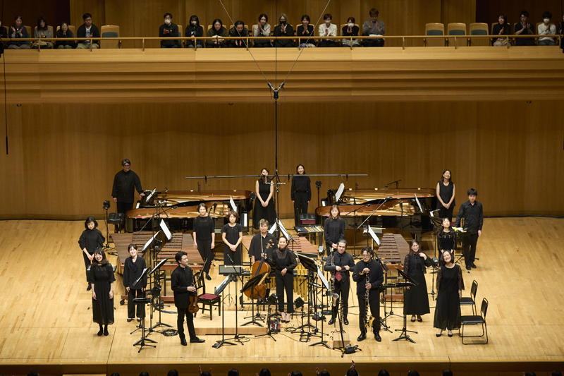 パルスの繰り返しとリズムの変化が特徴。ヴァイオリンの郷古廉は後半に進むにつれて、ノリが良くなっていく。クラリネットの亀井良信がしばしばアンサンブル全体に合図を出す。4人の歌手(東京混声合唱団:稲村麻衣子、大沢結衣、小巻風香、小林音葉)は、マイクを使って、音を伸ばしたり、短い音を繰り返したり、リズミックな音型を歌ったり、大活躍。マラカスも10分近く休みなく鳴らされる。そういう繰り返しを、機械ではなく、生身の人間がやるところが面白い。また、聴き手として、繰り返しによって、感覚がより覚醒されていくのを感じる。最後はヴァイオリンのトレモロで静かに締め括られた。