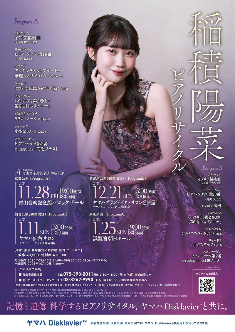 2025年11月~1月、京都・愛知・宮城・東京にて、稲積陽菜 ピアノリサイタル『伝統の継承、未知への探求-』が開催されることが決定した。