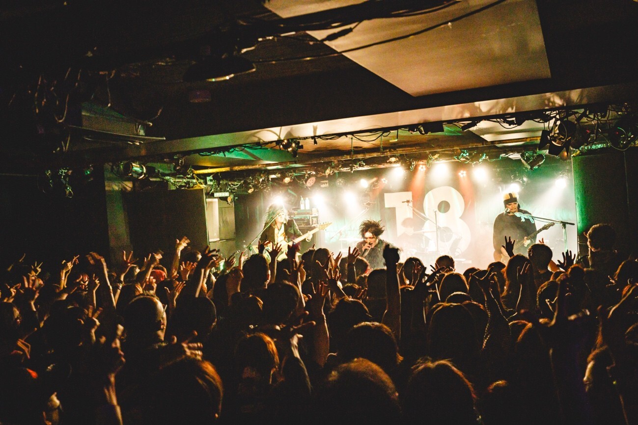 ところどころに煽りのような呼びかけはあったものの、ここまでMCは一切なし。アンコールも言葉を発しないまま、まずは『18』のリードソングである「東京亞詩吐暴威」をプレイ。80年代の日本のビートロックを我流に鳴らしたような陰影あるギターサウンドでフロアを酔わせると、そのままメロディアスな高速ハードコア「マシンガンララバイ」へと突撃し、最後は桜井の「ありがとうございました!」というシャウトと共に「龍動輪舞曲」でフィナーレ。《ロンドン・ロンド……♪》というフロアからのシンガロングを誘いながら明るく晴れやかな空気を醸造したところで、メンバーは去っていった。